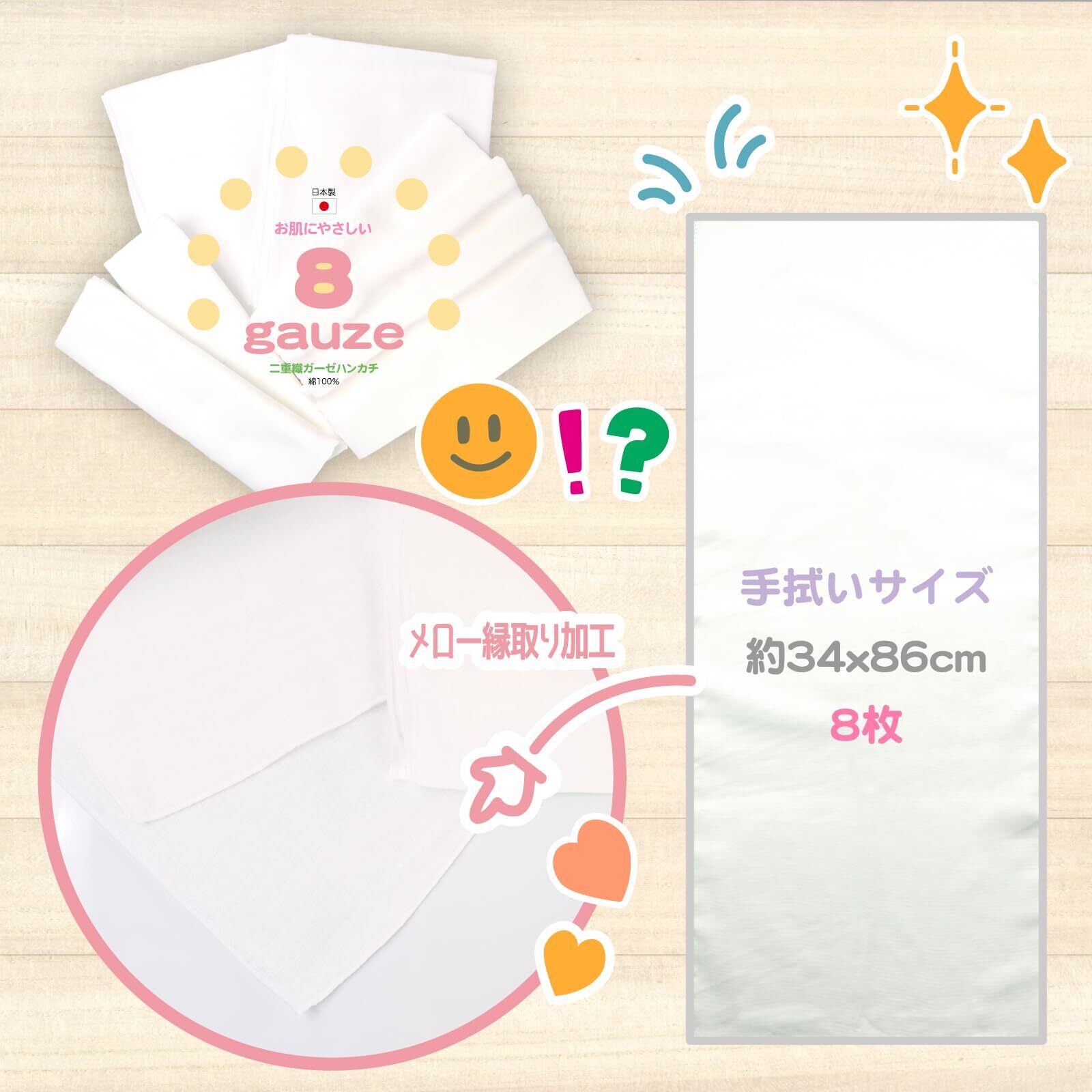 [クラスタ]8gauze ガーゼ 手拭い 8枚 セット綿100% メロー縁取り加工 日本製 ホワイト 2層 ガーゼ生地 赤ちゃん ベビー用 出産準備 お口拭き よだれふき 沐浴ガーゼ 無蛍光 無塩素加工 学校用 幼稚園