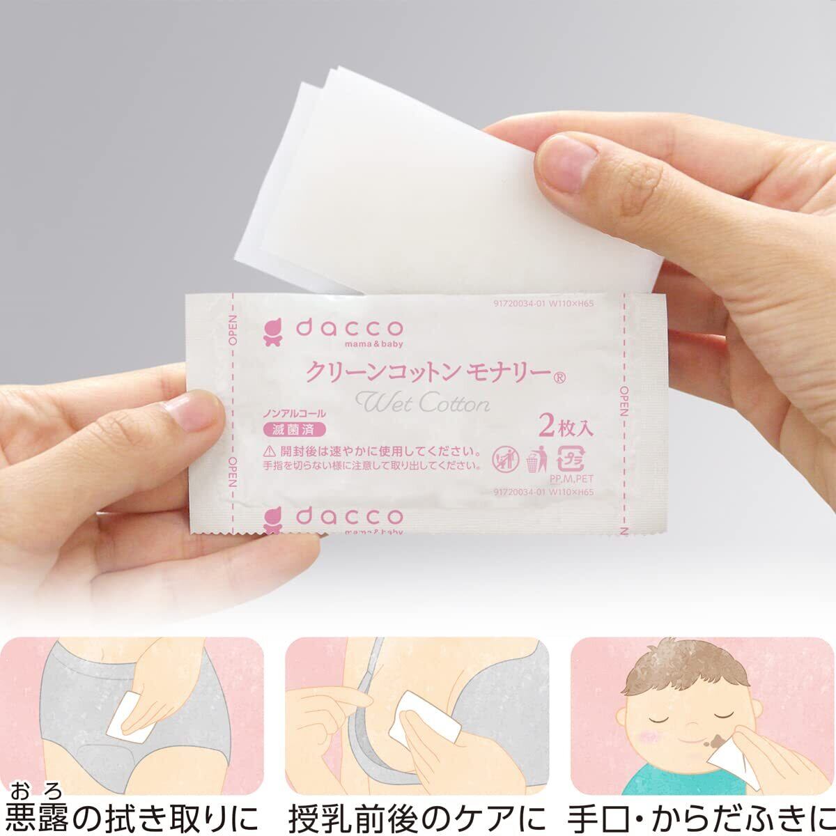 ●精製水を100%含浸させた、2枚入・単包滅菌済ウエットコットンです。●授乳時の乳房の清浄・清拭に1枚ずつ使用するのに最適です。●「エコテックス規格100」をクリアした、敏感肌にもやさしい脱脂綿を使用しています。●アルミ包装が水分の蒸発を防ぎ、常に清潔な状態で使用できます。●アルコール・香料は使用していません。