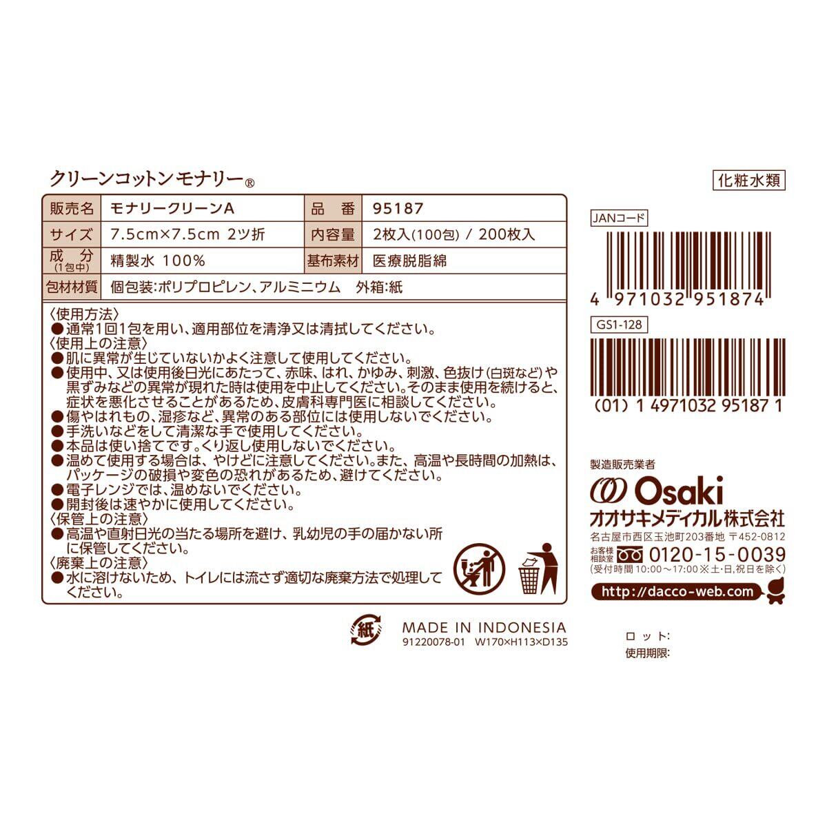 dacco(ダッコ) 単包滅菌済ウエットコットン クリーンコットンモナリー 100包入 精製水100% 95187