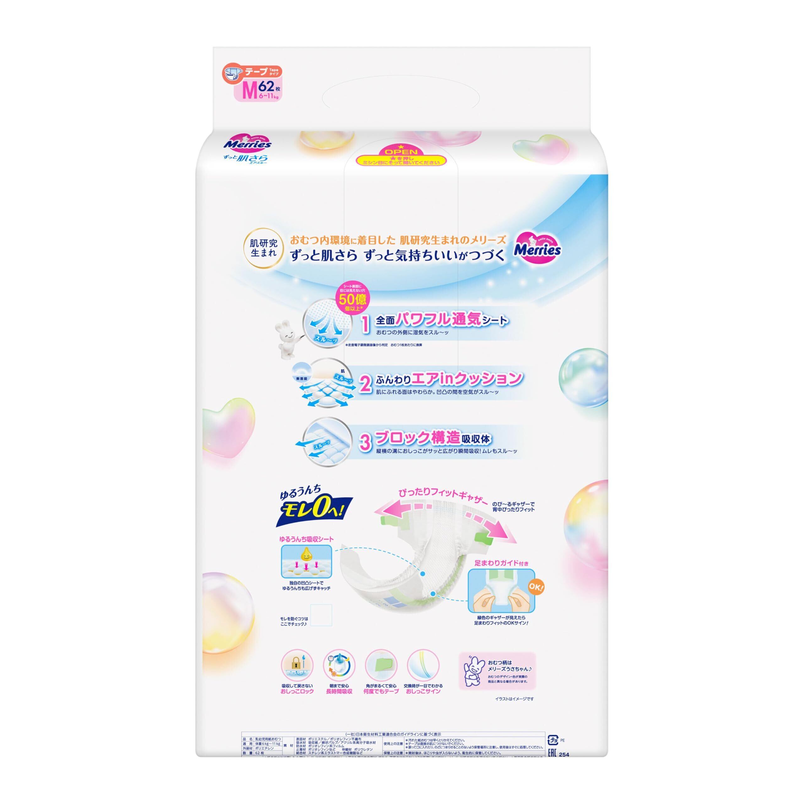 肌研究生まれ おむつ内環境に着目した 肌研究生まれのメリーズ ずっと肌さら ずっと気持ちいいがつづく おむつ柄はメリーズうさちゃん おむつのデザイン•色が実際の商品と異なる場合があります。 シート表面に目には見えない穴50億個以上* *走査電子顕微鏡画像から判定おむつ1枚あたりに換算 1 全面パワフル通気シート おむつの外側に湿気をスル~ッ 2 ふんわりエアinクッション 肌にふれる面はやわらか。凹凸の間を空気がスル~ッ 3 ブロック構造吸収体 縦横の溝におしっこがサッと広がり瞬間吸収!ムレもスル~ッ ゆるうんちモレ0へ! ゆるうんち吸収シート 凹凸で広げずキャッチ ぴったりフィットギャザー 横モレをガード 吸収して戻さない おしっこロック 朝まで安心 長時間吸収 角がまるくて安心 何度でもテープ 交換時が一目でわかる おしっこサイン 消臭成分配合 においが気にならない