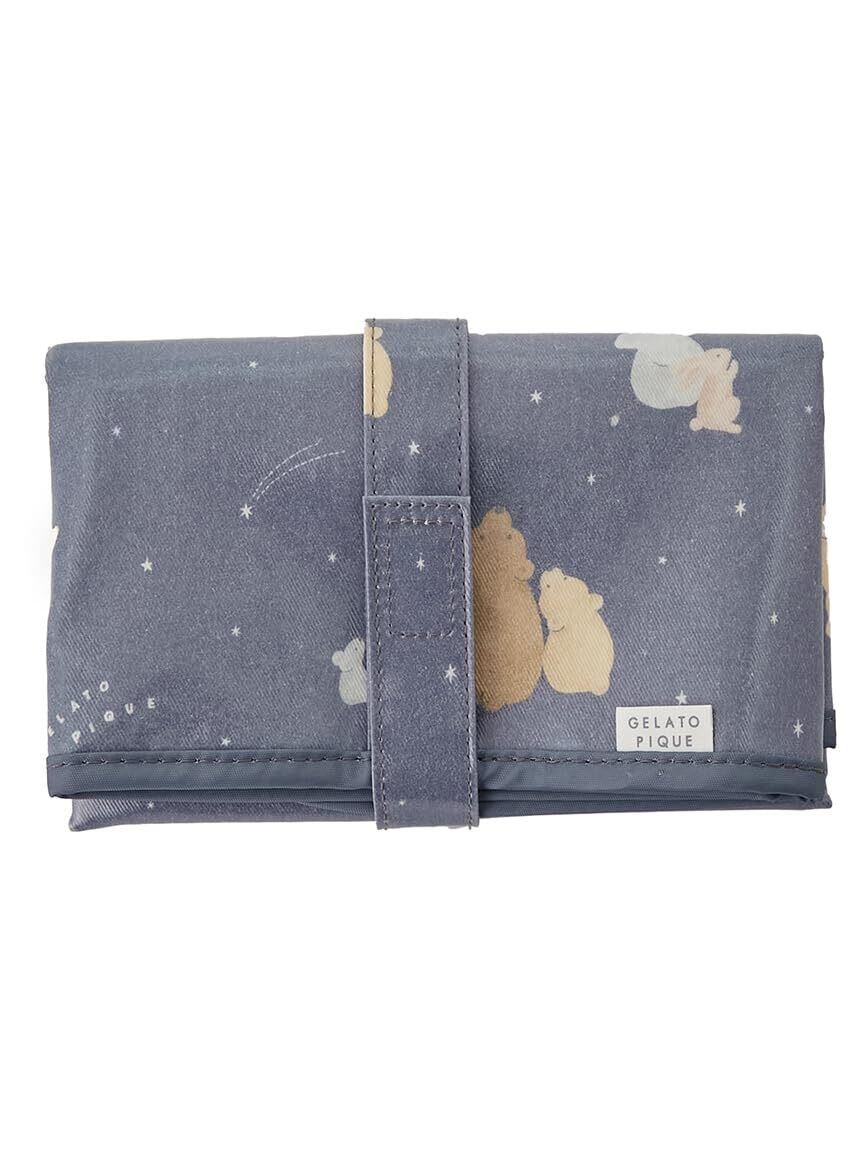 星空を見上げる動物たちをあしらった、ほのぼの優しい気持ちになれそうなママ小物シリーズです。ベビーとのお出かけに便利なおむつシートは、くるっと畳んでマジックテープで留めればコンパクトなサイズ感に。ママバッグにさっと入れて手軽に持ち運べます。表は汚れても拭き取りやすいコーティングを施しており、裏地は抗菌防臭加工済み。色はクリームとネイビーの2色を揃えました。同シリーズのママ小物、ルームウェアとコーディネートしたり、出産祝いのギフトにもおすすめです。