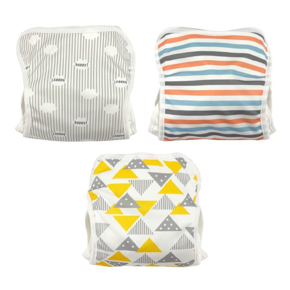 活発に動き始めた赤ちゃん向けの赤ちゃん自身でベルトを外しにくい内ベルトタイプのおむつカバー3枚組。
