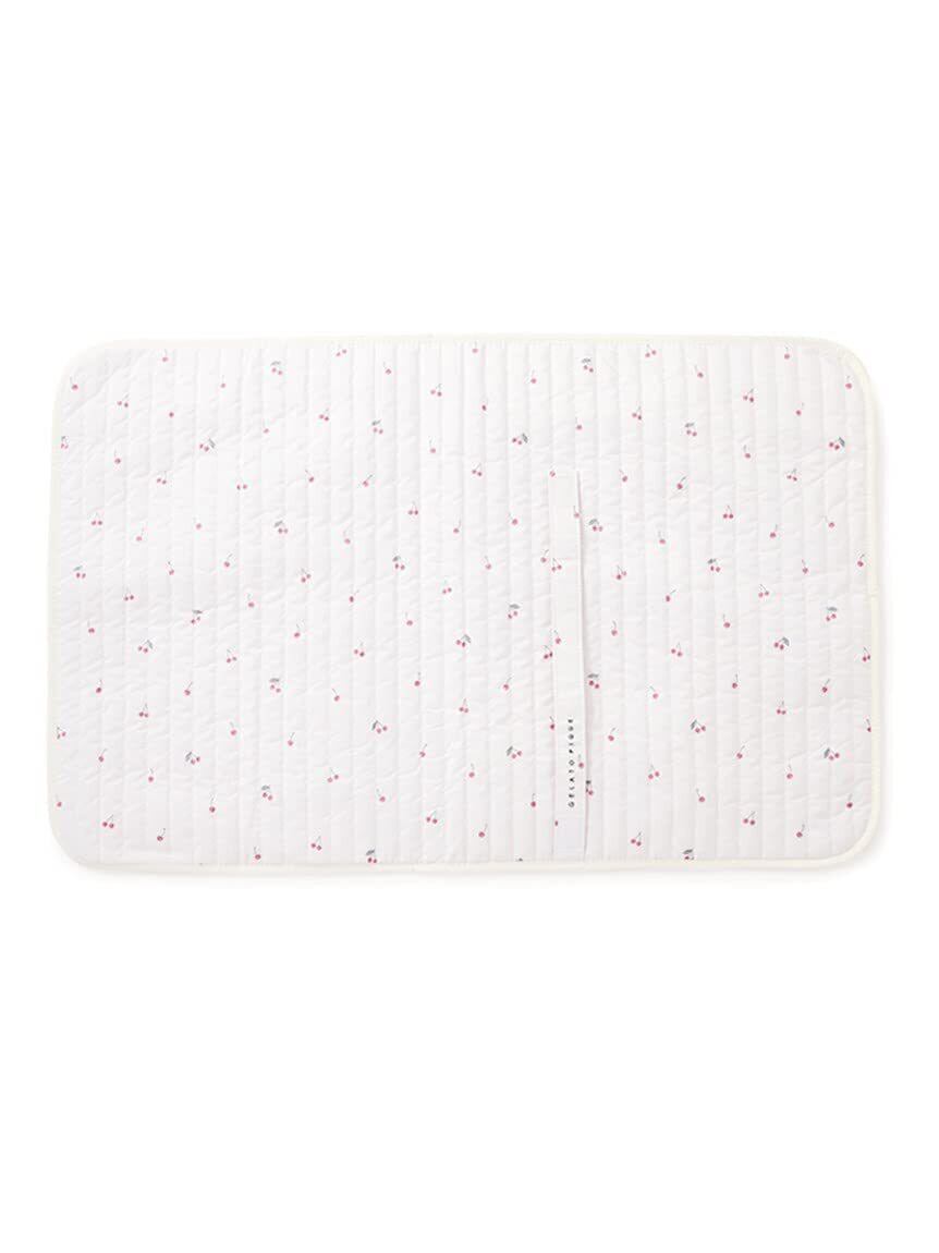 小さなサイズのチェリー柄と、キルティング素材の組み合わせが春らしくキュートなおむつシートです。くるっとコンパクトに折り畳めるマジックテープ付きで、ママバッグにさっと入れて持ち運び可能。裏地に抗菌防臭加工を施しているので、臭いが付きにくく汚れてもさっと拭き取れます。色はオフホワイトの1色展開。同柄の母子手帳ケースやママバッグとコーディネートしたり、出産祝いにも喜ばれるアイテムです。