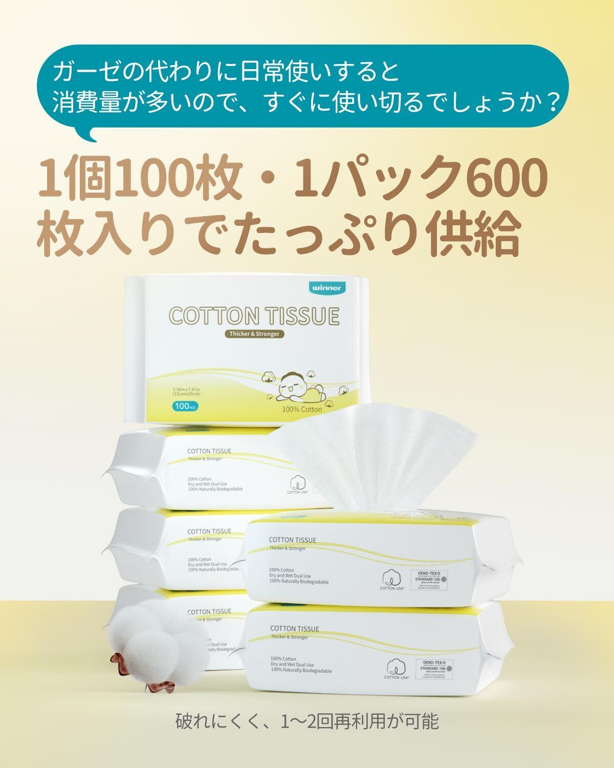 【大容量600枚入】Winner ベビードライコットンシート 使い捨てガーゼ 赤ちゃん 100%天然コットン 15x20cm クレンジングタオル フェイスタオル 使い捨て おしりふき 手口拭き ベビー肌・敏感肌・無添加・やわらか(6個*100枚)