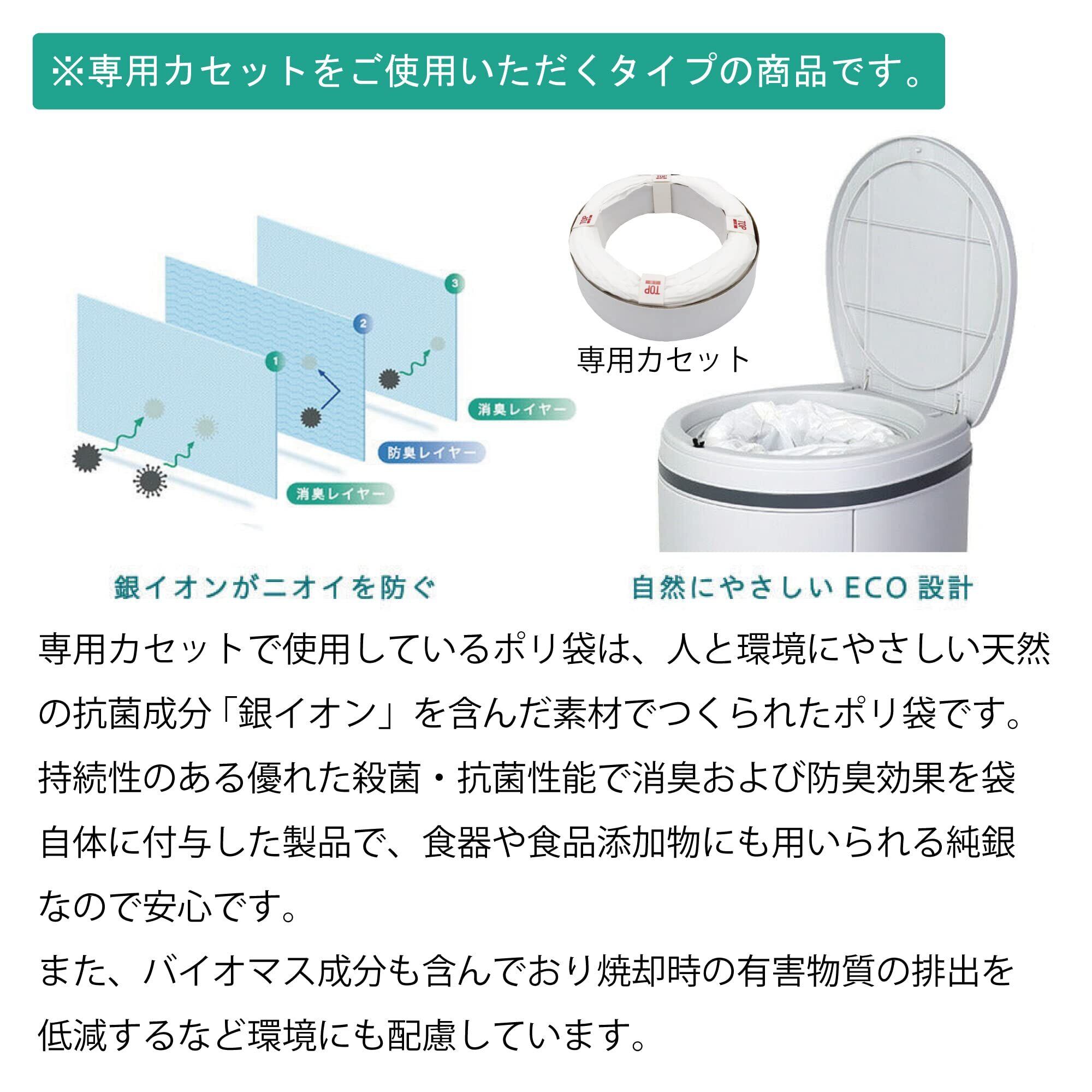 大容量21Lで新生児おむつなら最大約28個分入ります。専用のゴミ袋カセットには生分解性のエコ素材を使用。