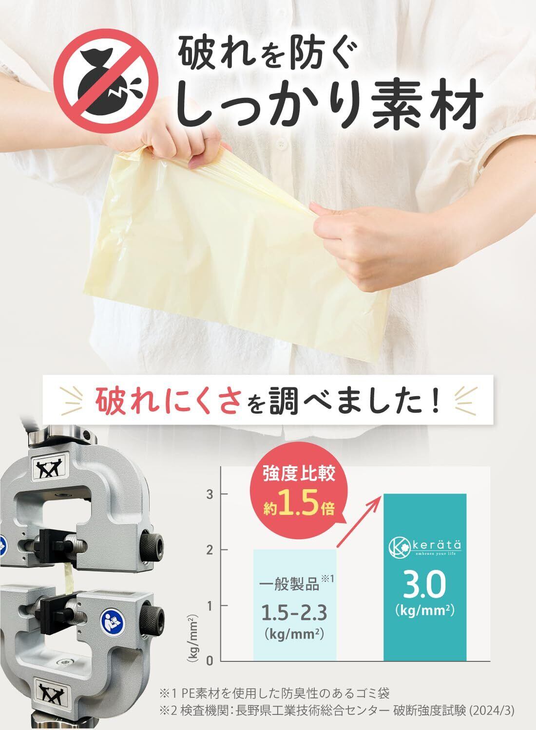 【7層フィルムで抜群の防臭力】 特殊な7層フィルムの力でしっかり防臭高機能素材を用いた多層フィルム構造により、臭いを閉じ込めます。臭いを消す(消臭)のではなく臭いを遮断(防臭)します。離乳食が始まったあとのおむつの臭いってきになりますよね、、、おむつをケラッタの臭わない袋に入れて捨てれば臭い漏れせずしっかり防臭します。出先でおむつ替えした際に出る使用済みのおむつも、すぐにケラッタの臭わない袋に入れて口をしっかり結べばもう臭いません。そのままバックに入れて家までOK。臭わないので安心して外出できます。