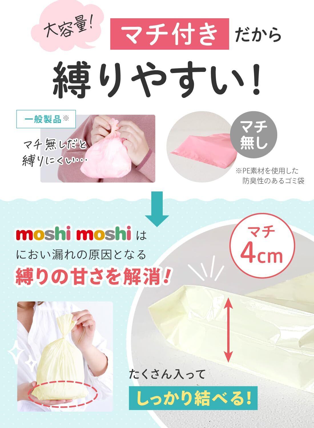 【マチ付きで簡単密閉】 おむつやペットのうんちを入れてしっかり縛ったのに時間が経つと結局臭いがしてくる…それはしっかりと結べていないことが原因のほとんど。ケラッタの臭わない袋は「マチ付き」で簡単にしばれちゃう! マチとは袋の広がり部分のことです。これにより袋の口部分に余裕ができ、だれでも簡単に結べるようになっています。つまり臭いを外に逃がしません!