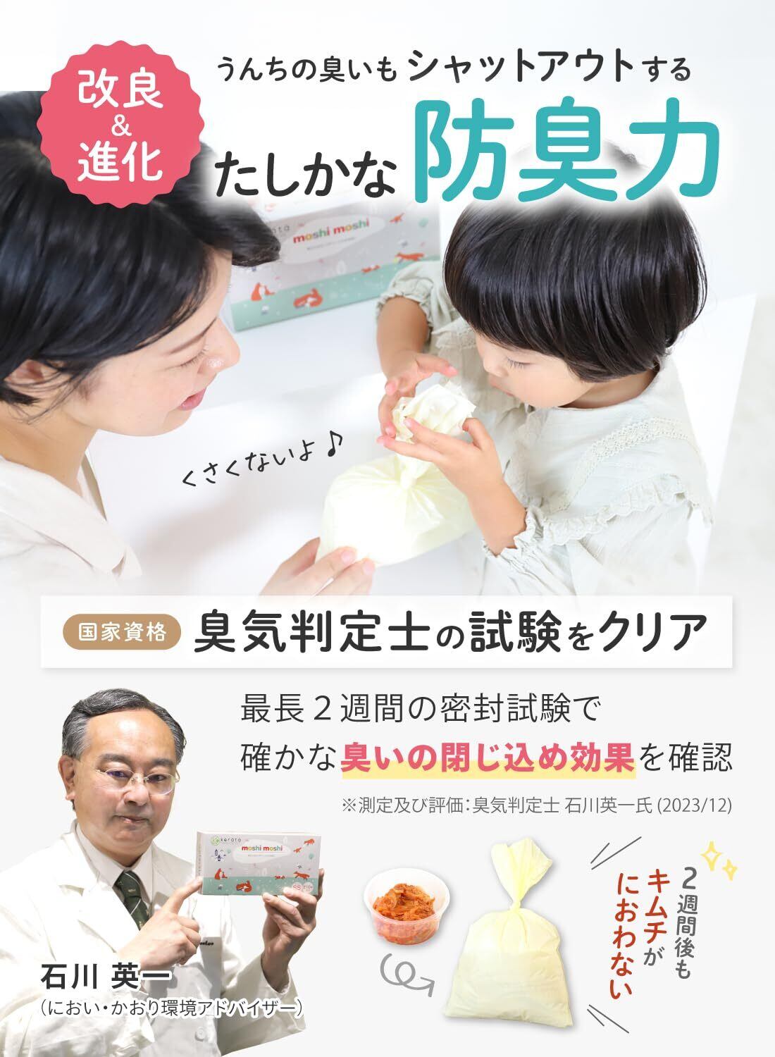 【臭い判定士のお墨付き】 国家資格「臭気判定士」を持ち、臭い探偵として臭い判定士のパイオニア・石川英一氏に判定していただきました!48時間以上臭い漏れしない、長時間の防臭力があるとの判定をいただいています。
