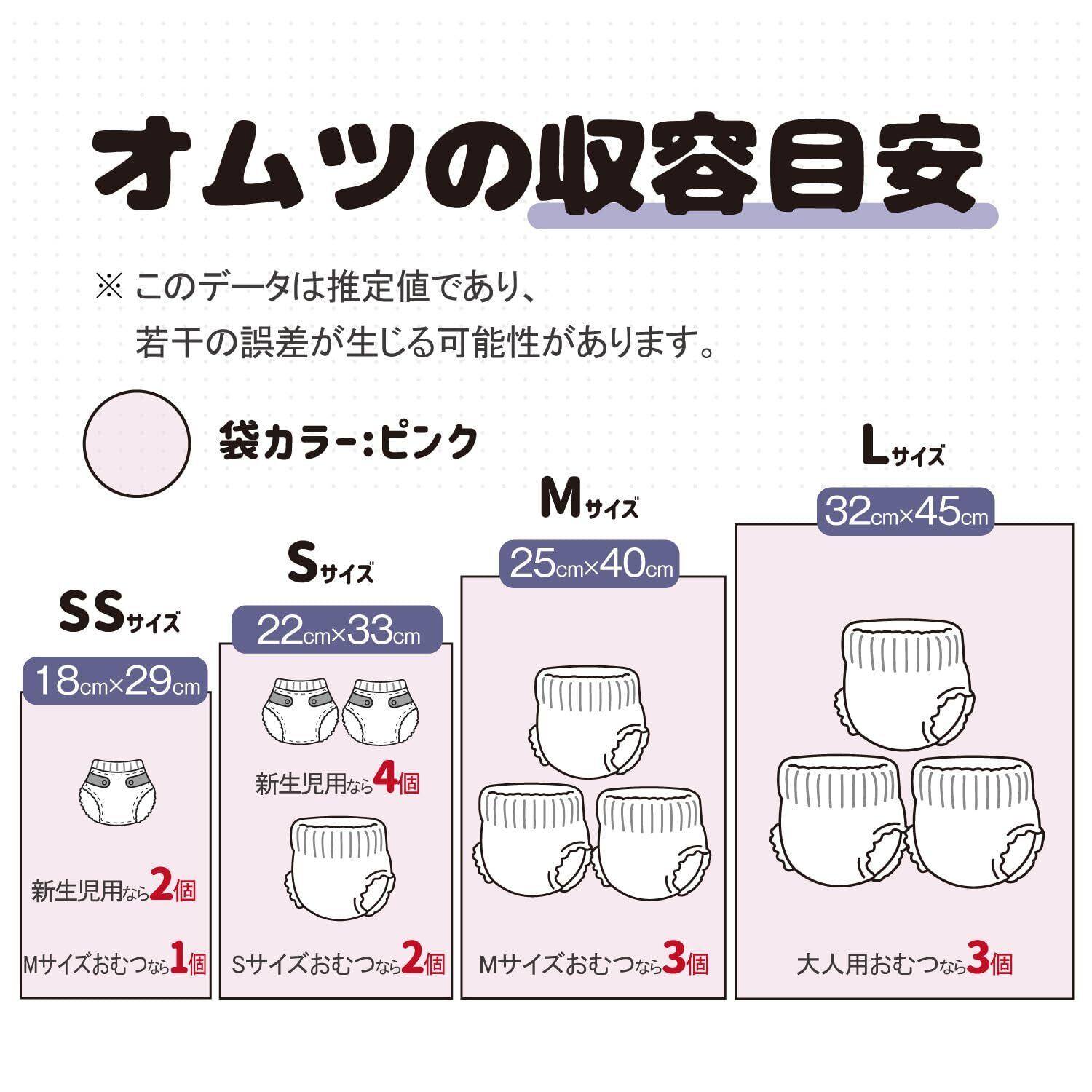 サイズ&カラー:Sサイズ(22x33cm)。上部に余裕があって簡単に袋の口を結びます。カラー:ピンク。色付きなので、中身が見えにくいです。