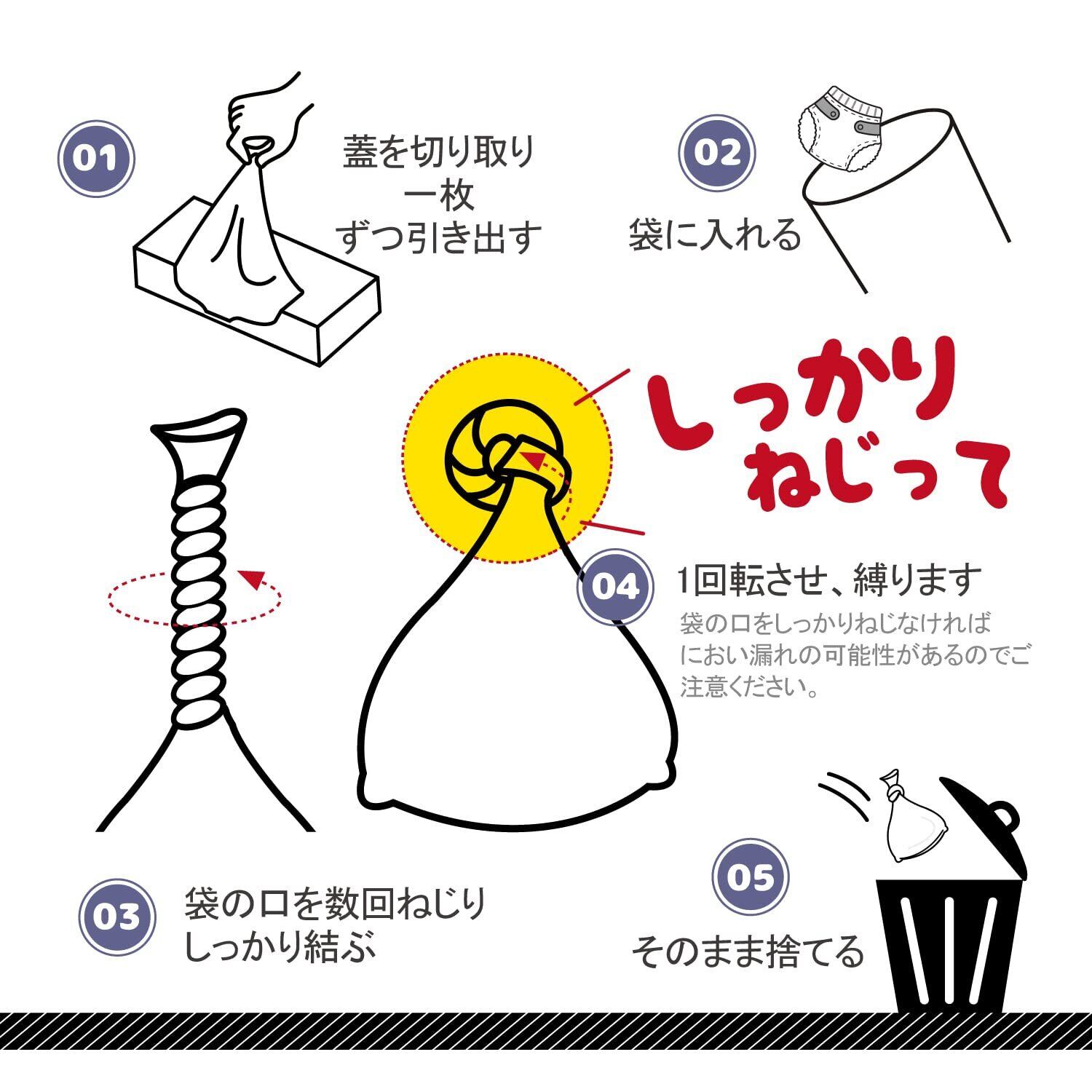 いろいろな場合で:赤ちゃん・大人のおむつ処理やペットの汚物処理だけでなく、嘔吐物や屋外の排泄物処理にも使用できます。におい移りやすい物の収納に適します。