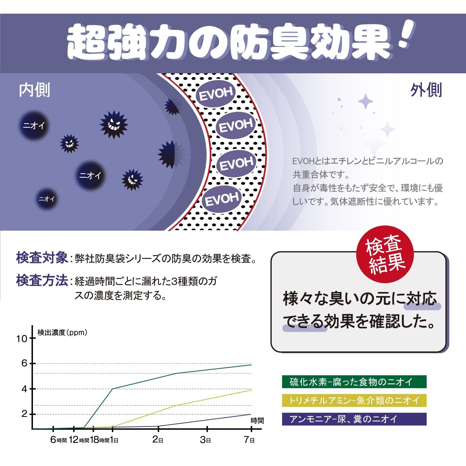 臭いをしっかり遮断:最高の気体バリア性があるEVOH樹脂(エバール)を採用して、びっくりするほどの臭わない袋を作り出します。強烈な臭いを放つ子供のおむつを袋に入れて縛った瞬間、ニオイが激減します。