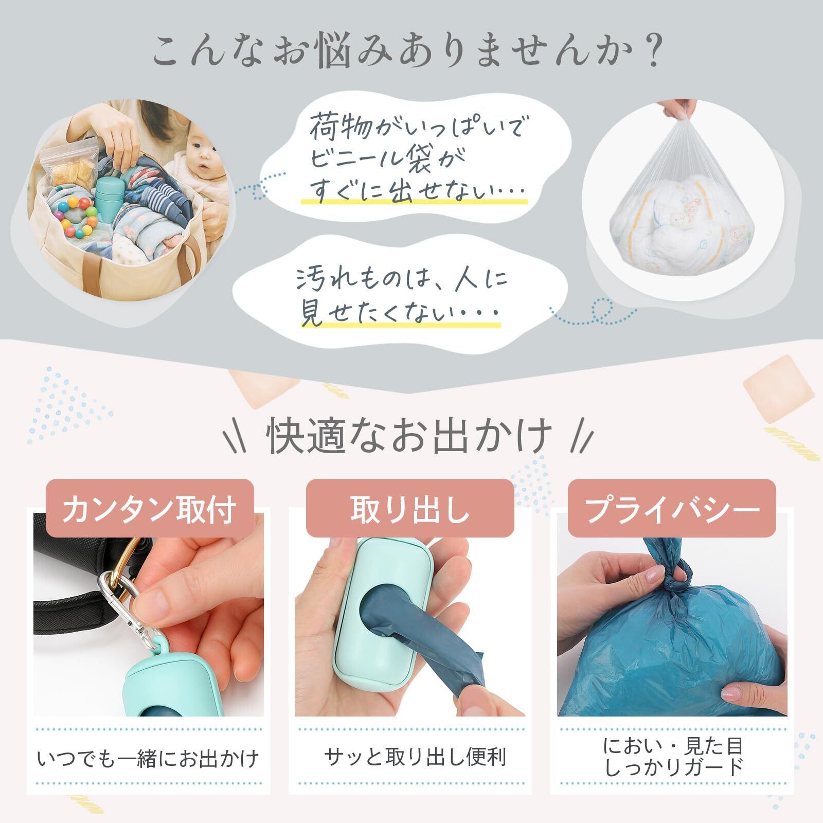 商品の推奨用途 外出、おむつ処理、赤ちゃん用ごみ袋、ドライブ、旅行など