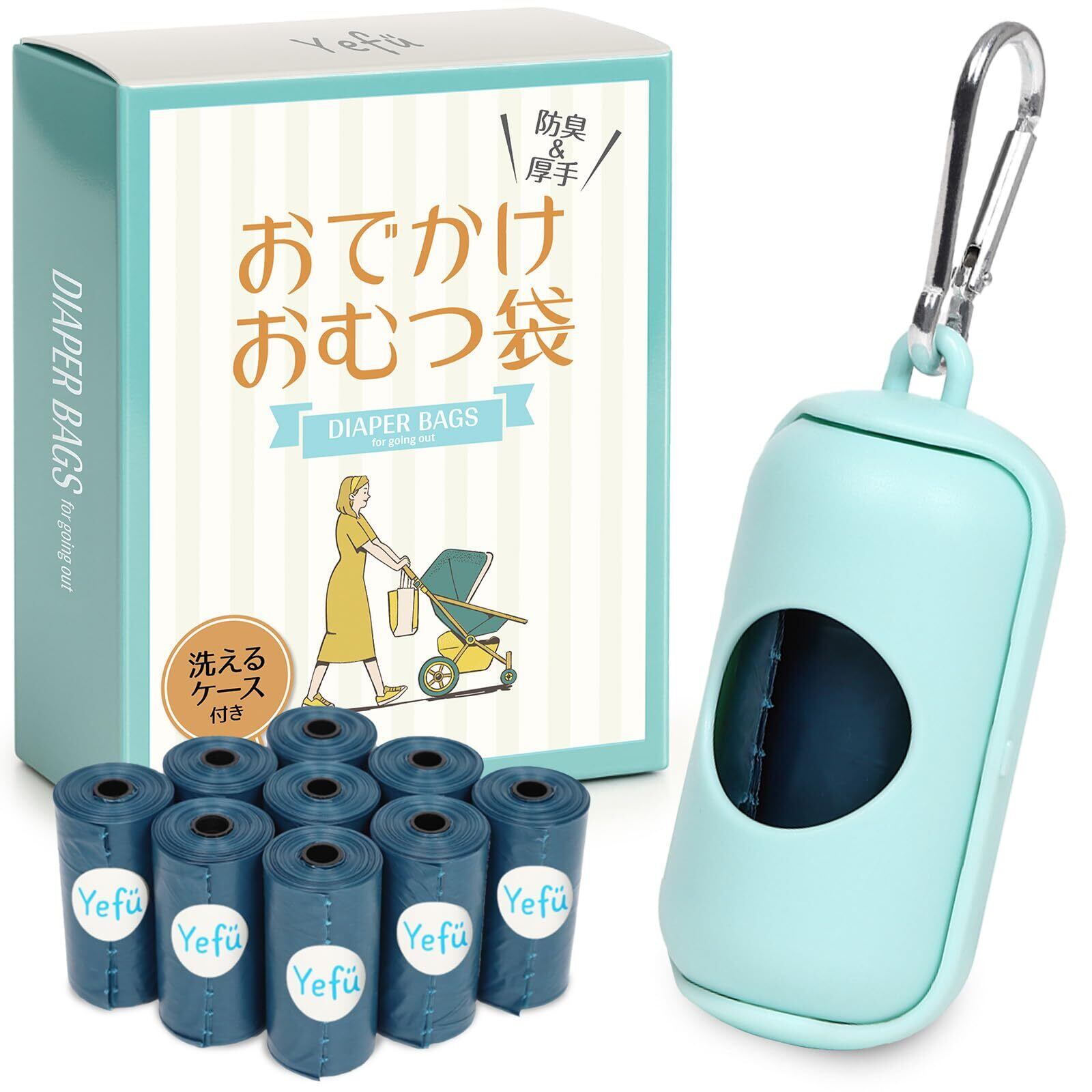 Yefu おむつ袋 使い捨て 防臭 消臭タイプ 100枚 ケース付き 厚手 ごみ袋 ベビー用 オムツ処理袋 におい対策 携帯 お出かけ 外出 アウトドア (ミントブルー)