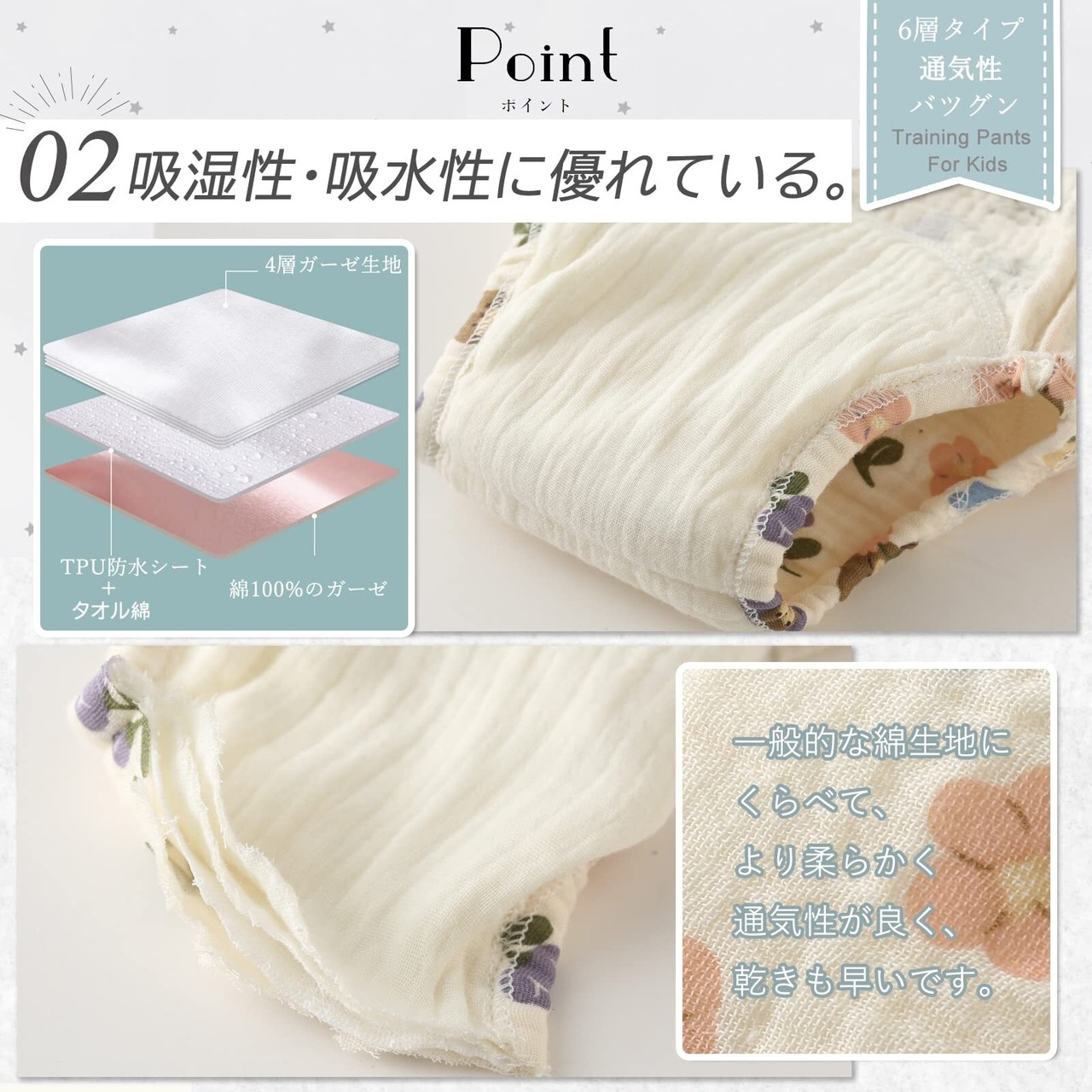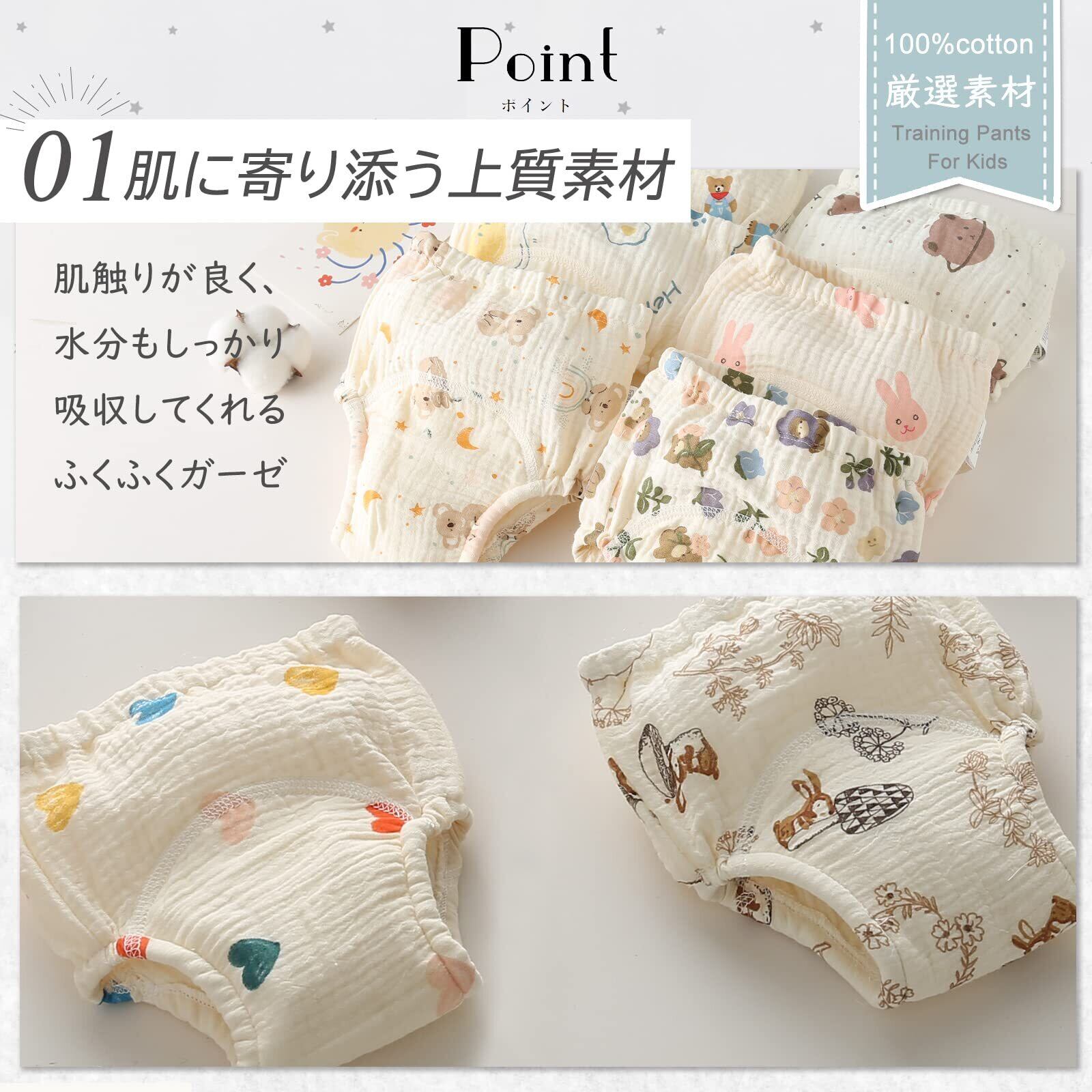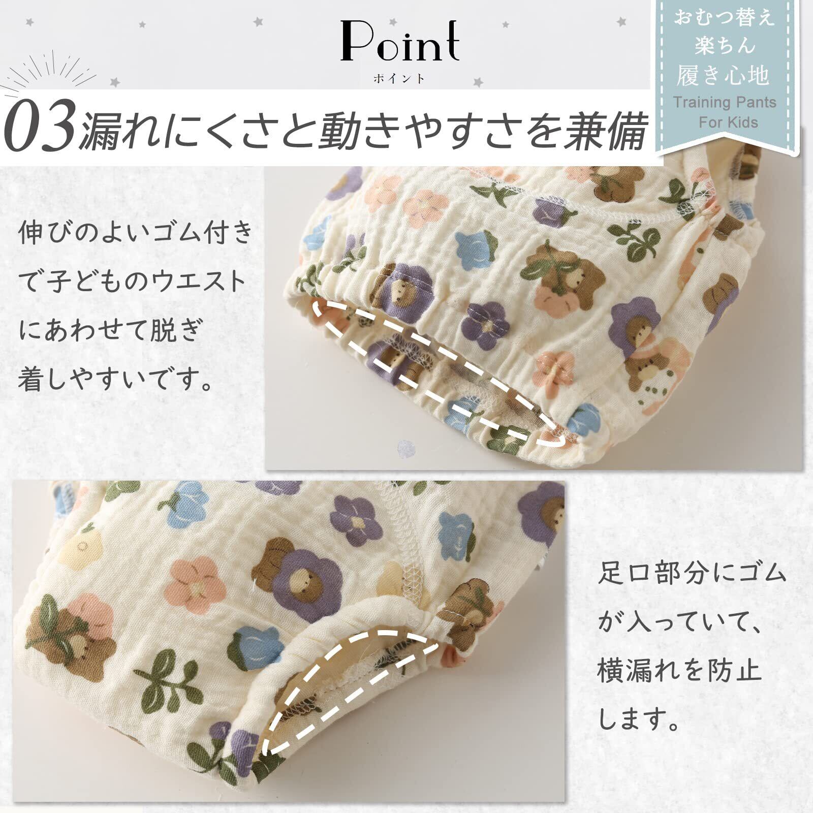 【肌に寄り添う上質素材】赤ちゃんの薄い皮膚に配慮し、コットン100%のガーゼをを採用したパンツです。一般的な綿にくらべて、より柔らかく通気性にも優れており、乾きも早いです。汗を吸収し保湿性にも優れているので、赤ちゃんの繊細なお肌を守ります。