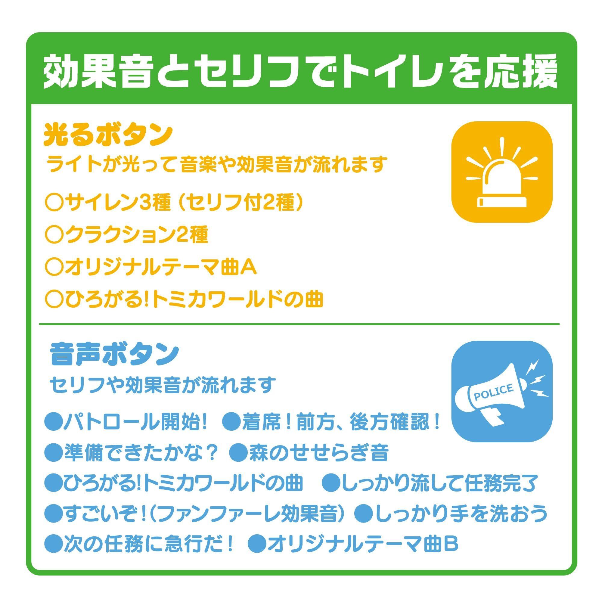 ・ひろがる!トミカワールドの音楽、パトロールカーのサイレン音やトイレトレーニングを促すセリフなどの16種類のサウンドを収録!