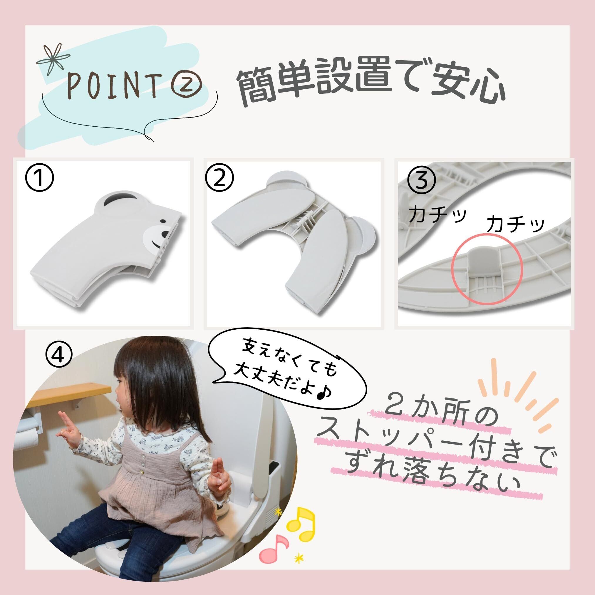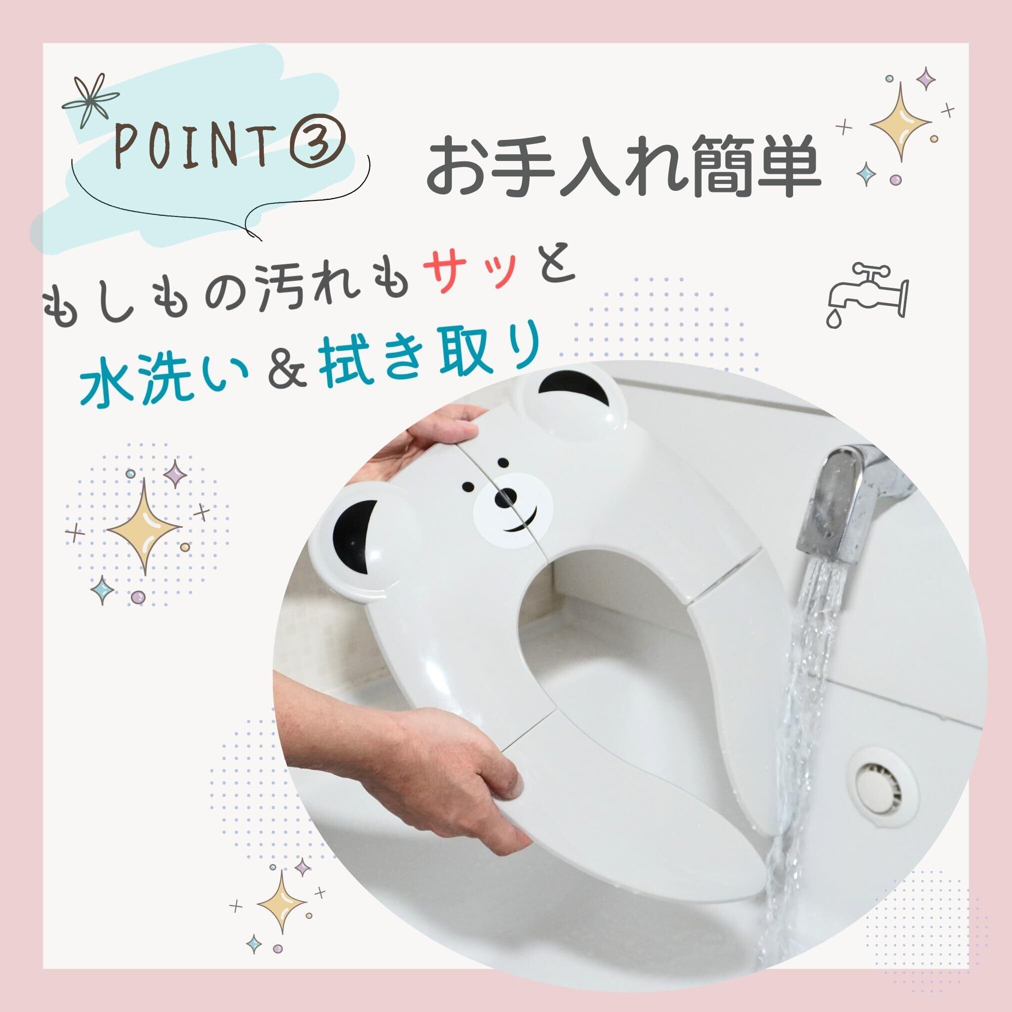 【設計】大人用の便座では心配…という時に、自宅はもちろん外出先でも落下防止をサポートし安心! コンパクトに折り畳めて省スペースでの収納、持ち運びに便利! 簡単に設置できます。 いつでもどこでもトイレトレーニングが可能! 収納ポーチ付きで旅行や帰省などにも最適です。