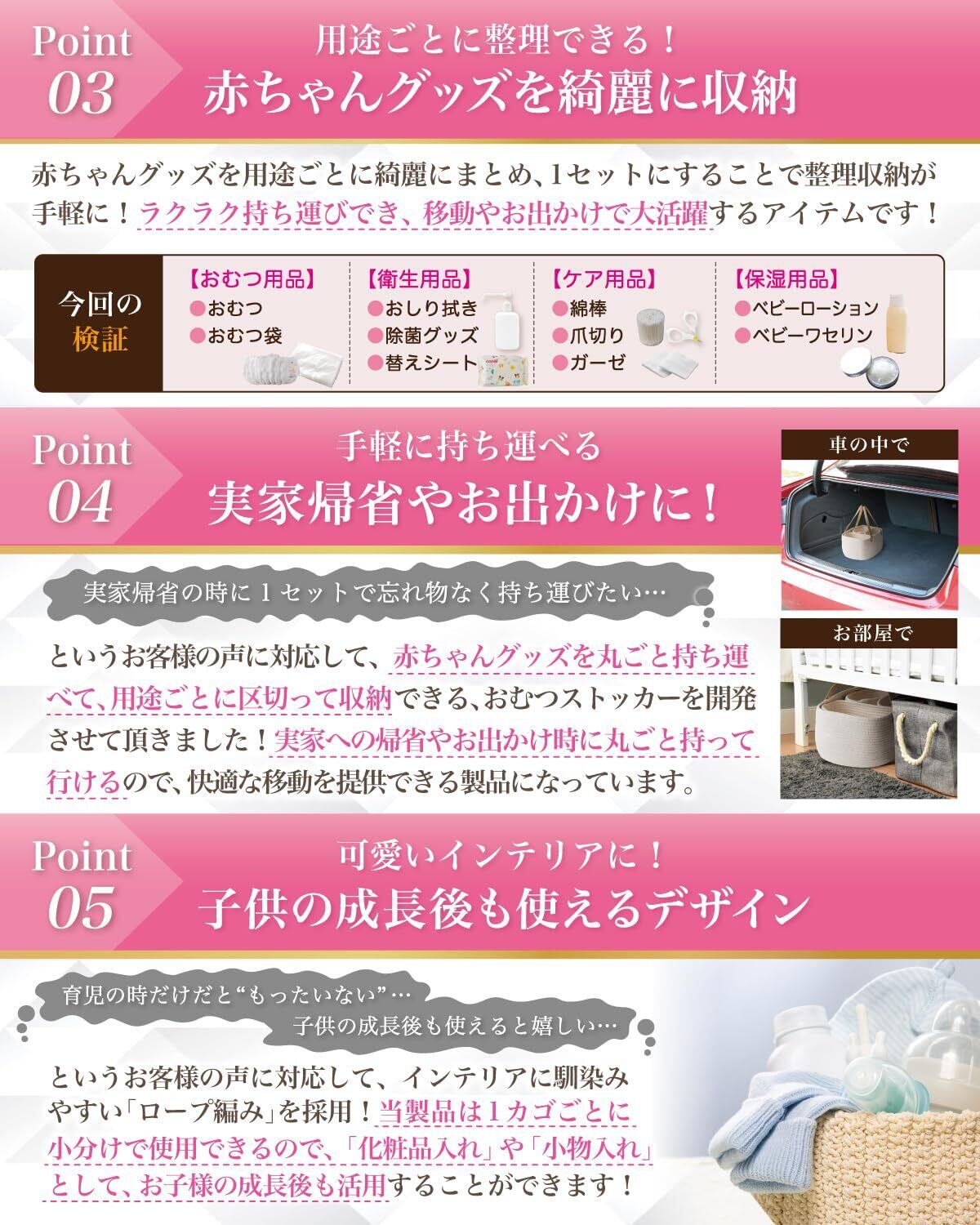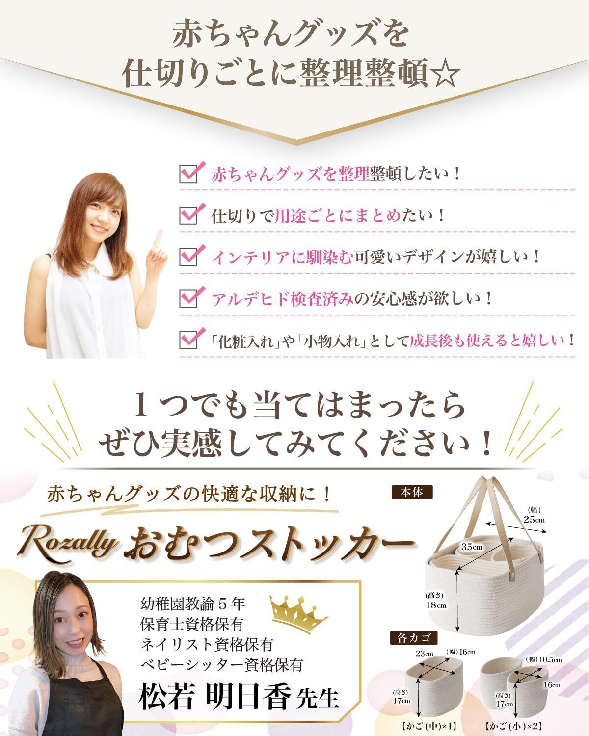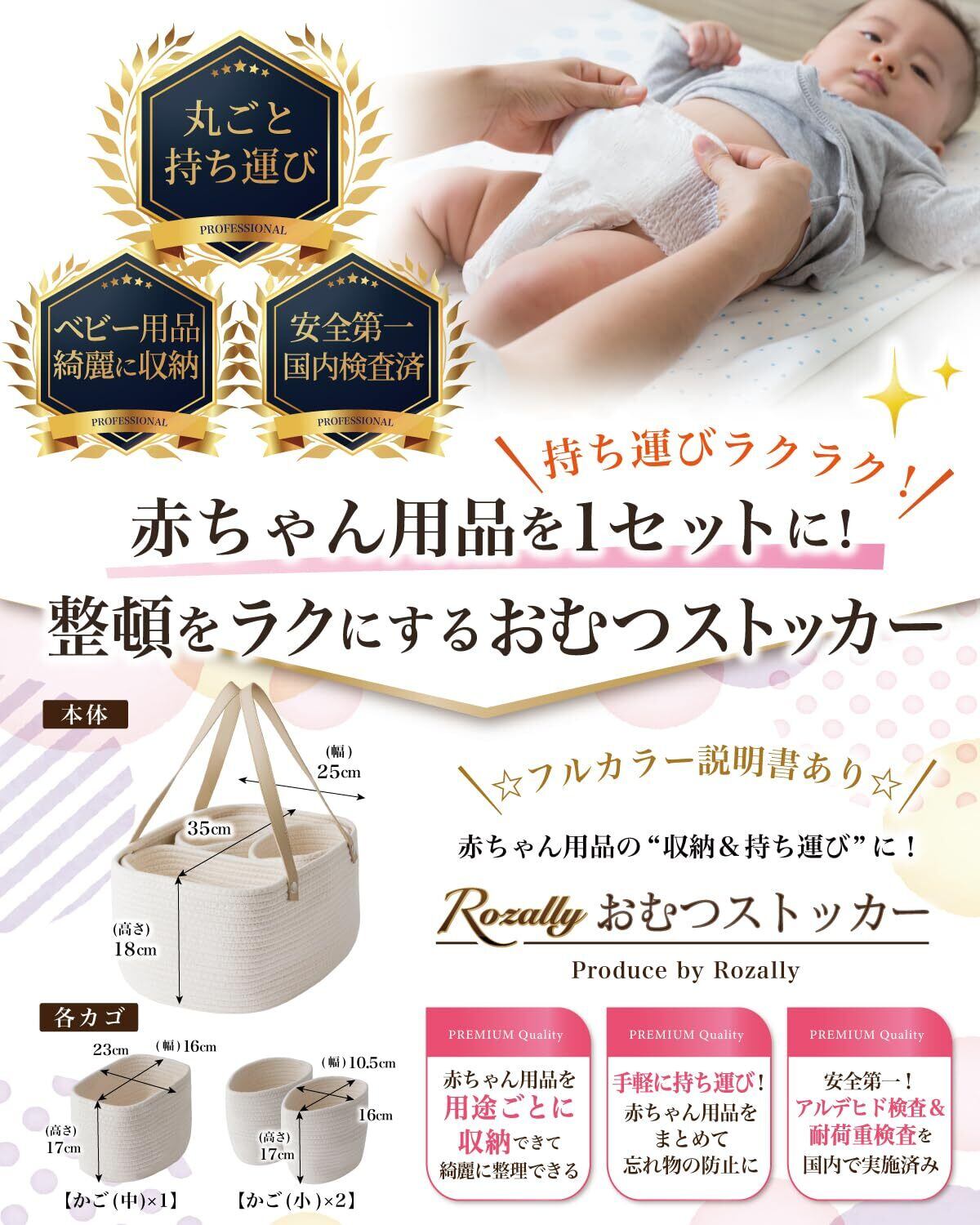 【保育士が監修】 Rozally おむつストッカー がついに正式販売開始。 「赤ちゃん用品 が多くて綺麗に収納できない…」というお客様の声から生まれた おむつ や ベビー用品 を1つに収納にして 持ち運び 可能にする バスケット 型の 大容量 オムツストッカー です。 企画&設計では 新生児 や 乳幼児 など 子供 の育児に詳しい【保育士】の先生からアドバイスをもらい、 おむつストッカーに入れておく赤ちゃん用品推奨リストなたフルイラスト説明書を添えさせて頂きました。 弊社のおむつストッカーでは可愛いデザインのロープ編みを採用して、おしゃれな外観で製品化を進めましたので、出産祝いやギフトにも最適になっています。
