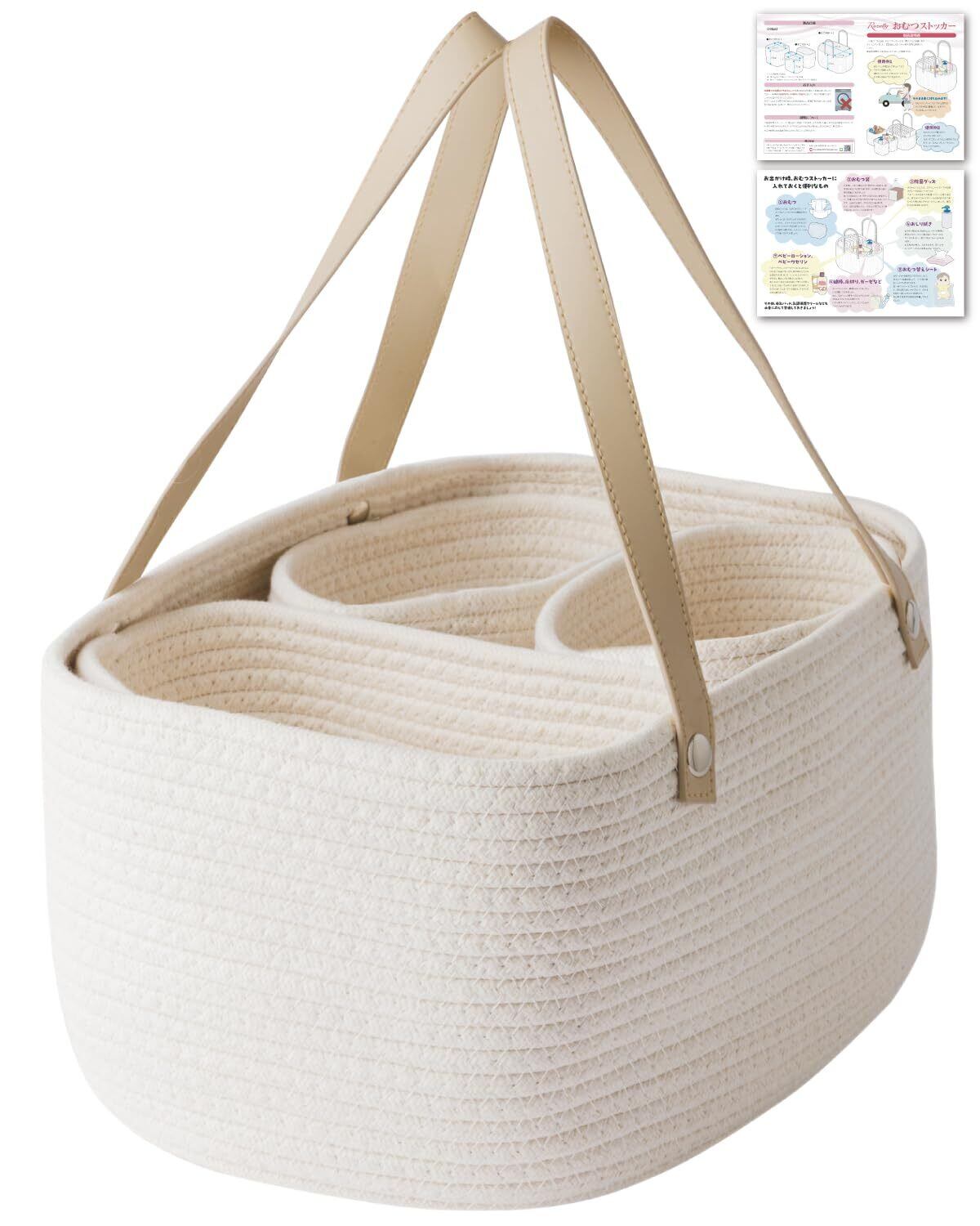 【保育士が監修】 おむつストッカー おむつ収納 おむつバッグ おむつかご おむつ入れ 収納ボックス おむつ 持ち運び 車 ロープ編み 大容量 仕切り 小さめ おしゃれ 可愛い (ホワイト)