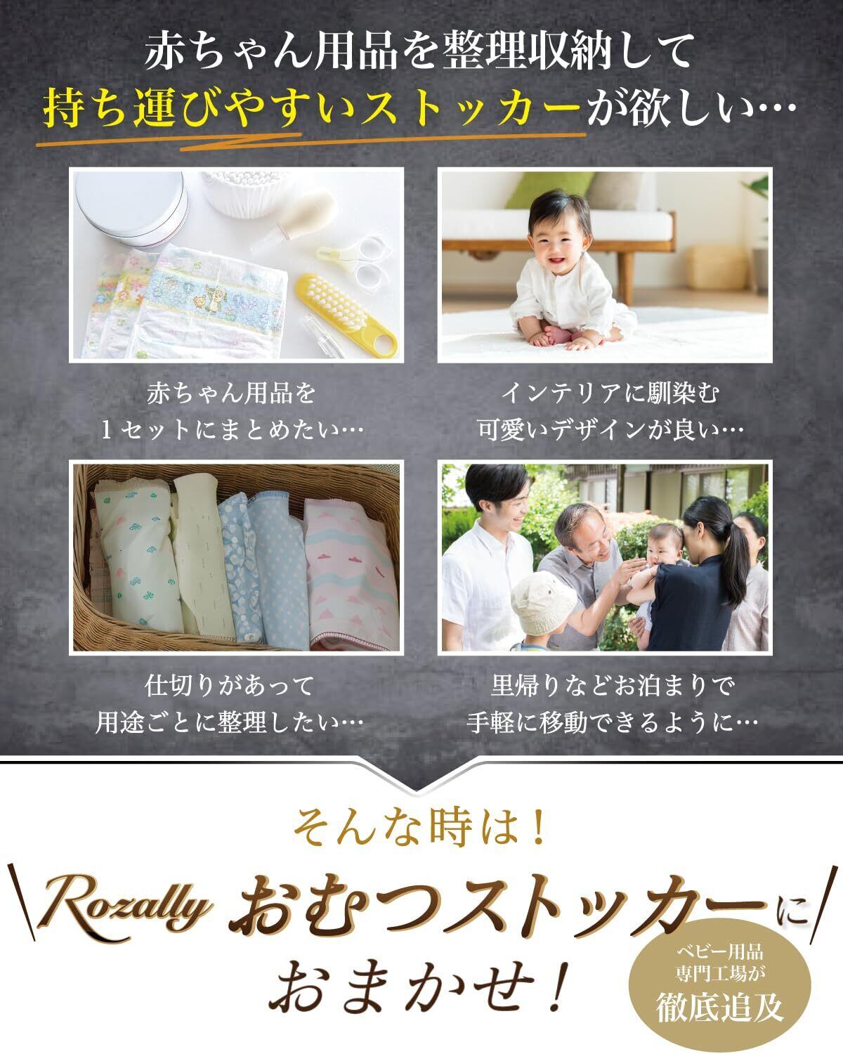 【こだわり】様々なメーカーから おむつストッカー や おむつバッグ として” おむつ収納 用品 ”が販売されていますが、Rozallyの おむつストッカー は”こだわり”が一味違います。 ベビー用品をメインに取り扱っている10社以上の工場からサンプルを取り寄せ、「綺麗なおむつ収納×持ち運び」を一緒に試行錯誤して頂けた1社に絞って発注を行なっています。お子様の成長後も小物入れとして使用できる可愛いデザインになっています。