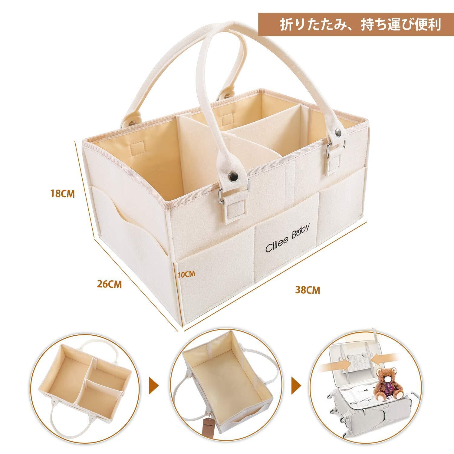 Ciilee Baby おむつストッカー オムツバッグ 大容量 取り外せハンドル オムツケース 折りたたみ ベビー 収納ボックス カゴ 車載旅行用バック 収納カコ 小物入れ 軽便 ベビー用品 育児用品入れ (仕切り3つ(ベージュ))