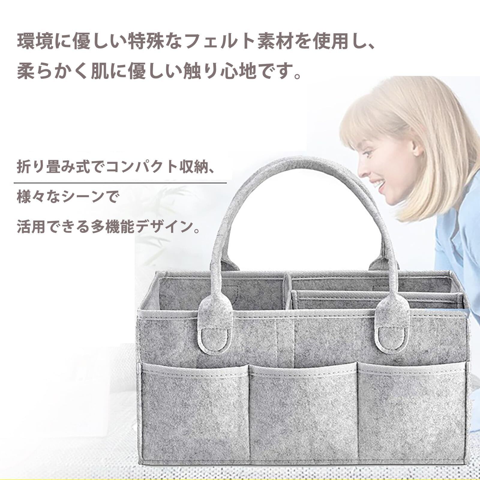 おむつや赤ちゃん用グッズの整理に最適なフェルト製収納バッグ。3種類のデザインからお選びいただけるため、ニーズに応じた最適なタイプをお選びいただけます。ベーシックタイプはしっかりとした縁取り付きで耐久性抜群。エコノミータイプは縁取りがなく経済的な選択肢。ファスナー付きタイプは側面にファスナーがあり、小物が散乱するのを防ぎます。サイズは38cm x 26cm x 18cmの大容量で、おむつだけでなく、着替えやおもちゃ、その他のベビー用品もまとめて収納可能。持ち運びやすく、お出かけや旅行にも便利です。