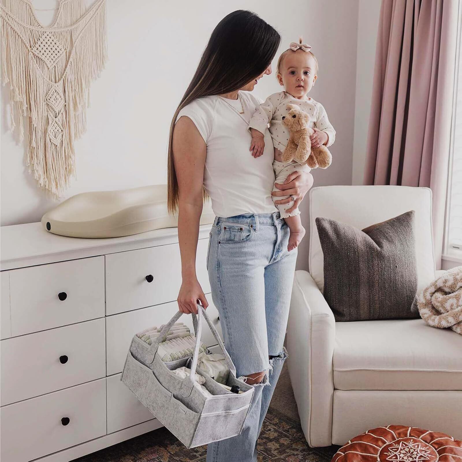 1.大容量で多機能:38cm x 26cm x 18cmの広々としたサイズで、おむつや着替え、哺乳瓶、タオルなど、必要なベビーアイテムを一括収納。