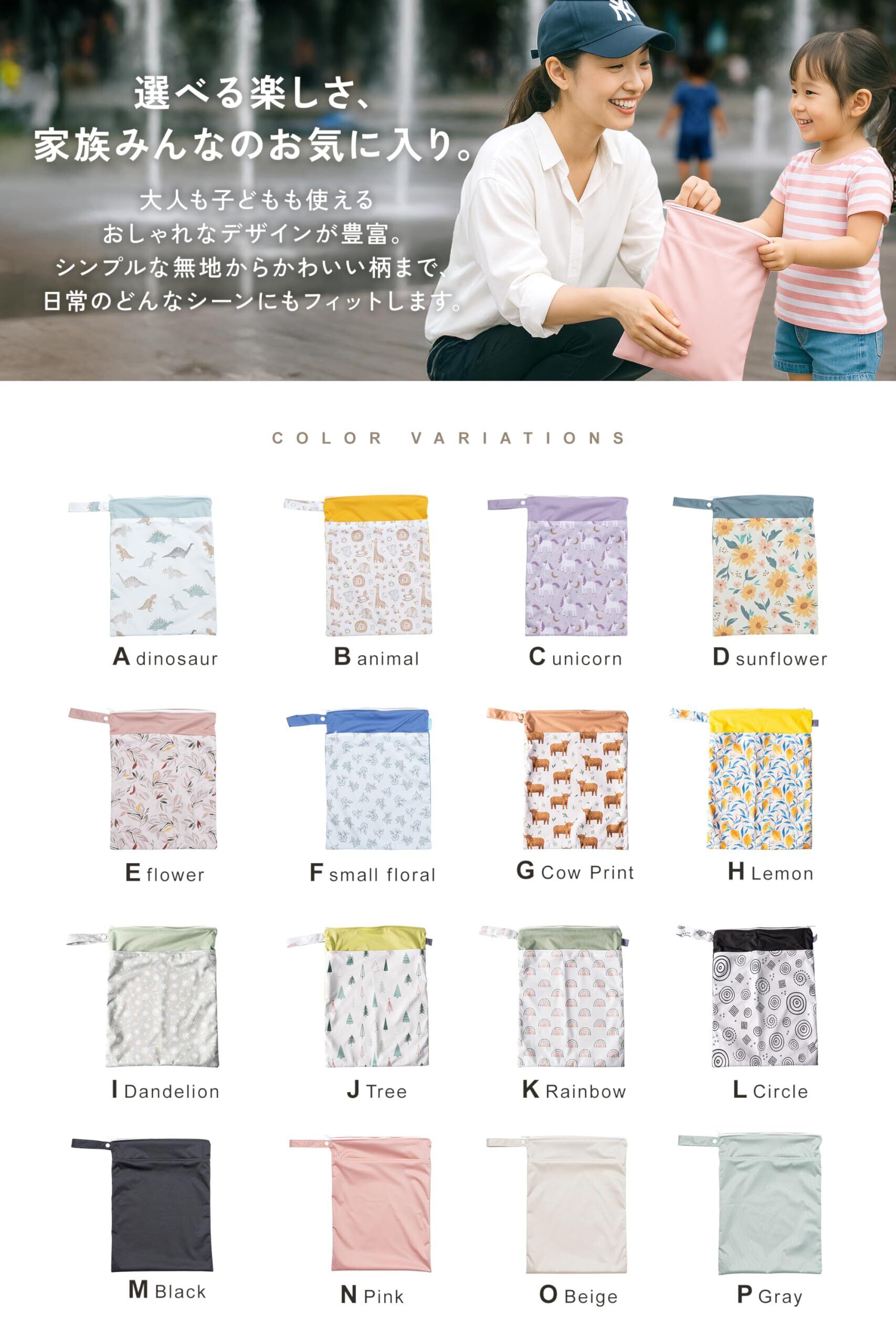【商品の仕様とカラーバリエーション】 素材: ポリエステル生地+TPU防水加工 / サイズ: 縦約40cm×横約30cm / セット内容: 防水マルチポーチ1点 / 安全性: SGS認証工場製造(世界的品質基準クリア) / カラーバリエーション: dinosaur・animal・unicorn・sunflower・flower・small floral・Cow Print・Lemon・Dandelion・Tree・Rainbow・Circle・Black・Pink・Beige・Gray