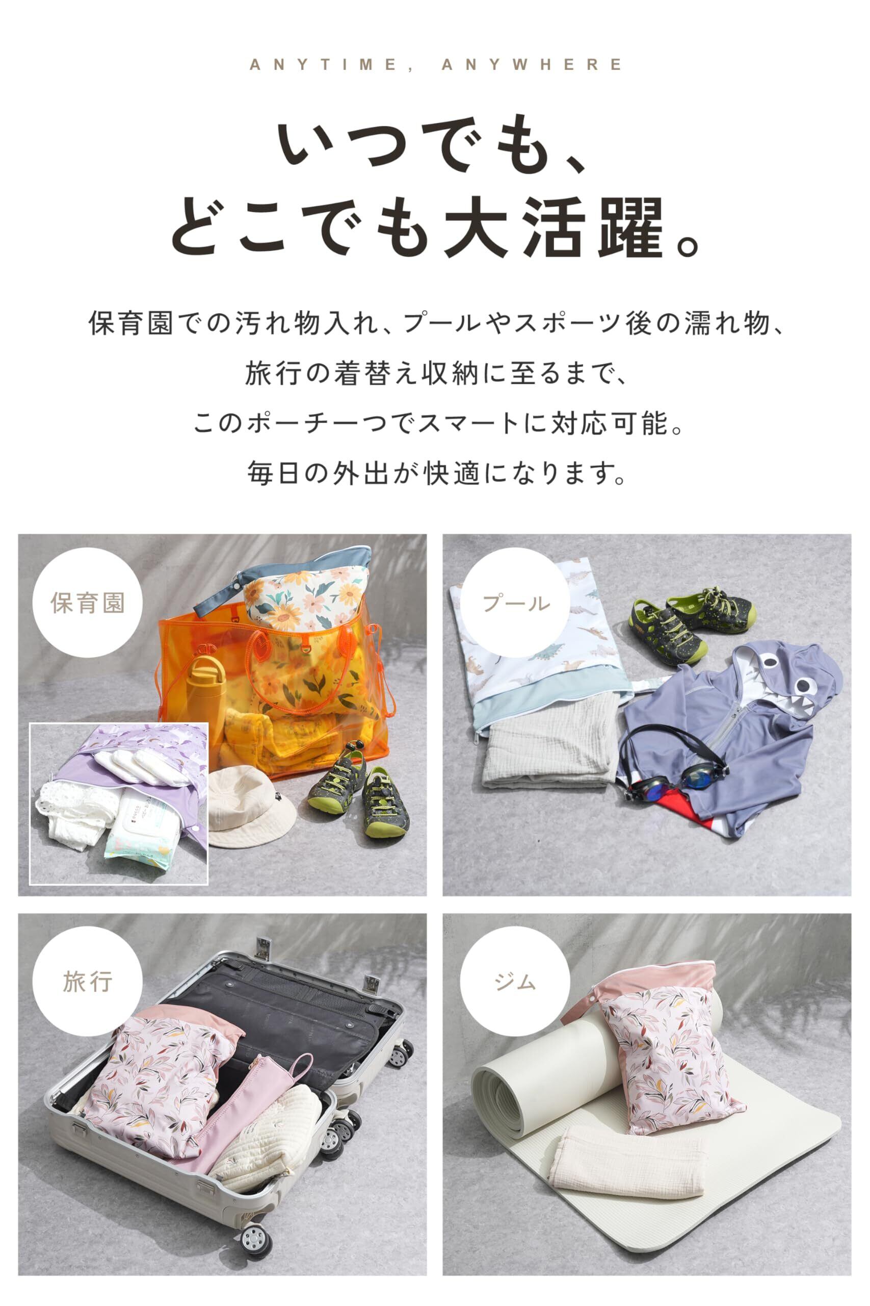 【多用途で便利なデザイン】 保育園の汚れ物入れからプールやスポーツ後の濡れ物、旅行時の着替え収納やジム用としても活躍する万能な防水ポーチです。便利なサイズ感(約30cm×40cm)で収納力抜群。バッグに入れてもかさばらず、外出先での突然の濡れ物や汚れ物にもスマートに対応可能です。家族のさまざまなシーンで頼りになる一品で、日常の困った場面を素早く解決します。