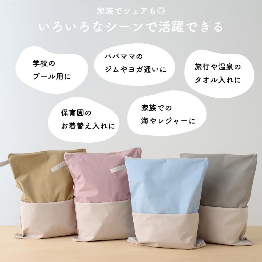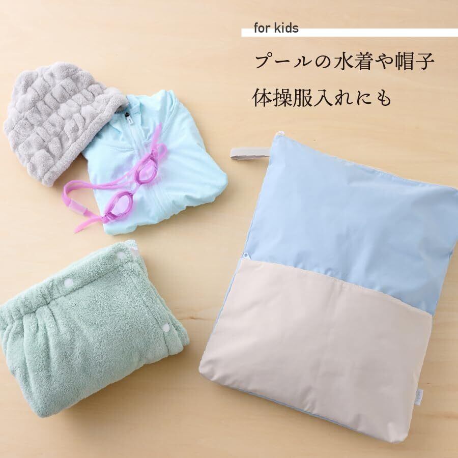 キッズも大人も使いやすい、シンプルでおしゃれな防水ポーチ。 表面は撥水、裏面はTPU防水加工で、濡れたものもそのまましまえて安心。プールや水遊び後の濡れたタオルや水着、保育園でのお着替え・汚れ物入れ、ジムやヨガでの使用など、幅広いシーンで活躍します。折りたたんでランドセルにしまえるサイズ感で、持ち運びにも便利。表面にはポケット付きで小物の整理もしやすく、使わない時はゴムバンドでコンパクトに。洗濯OKでお手入れも簡単です。