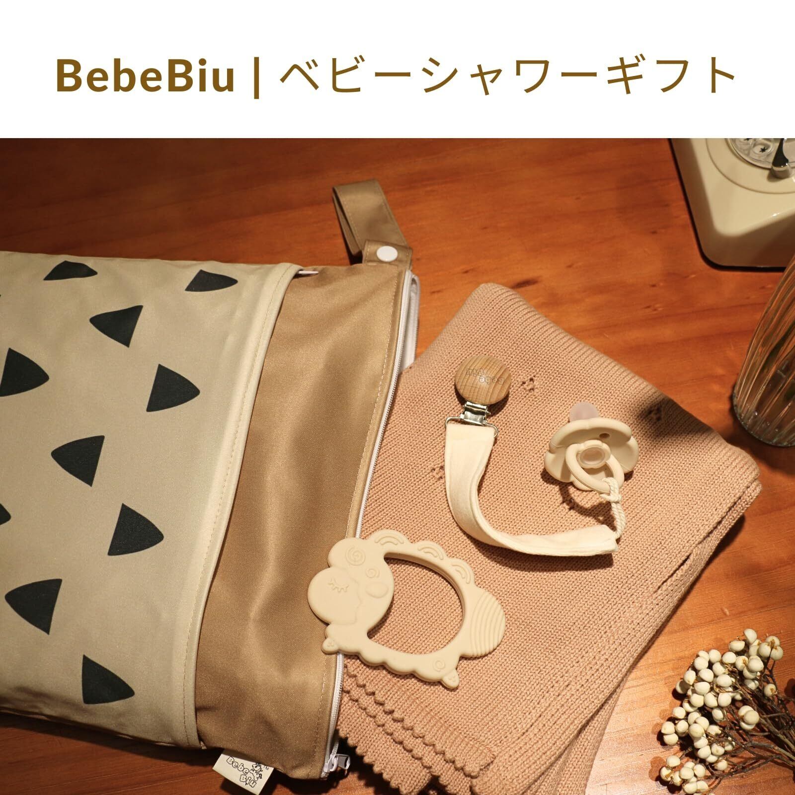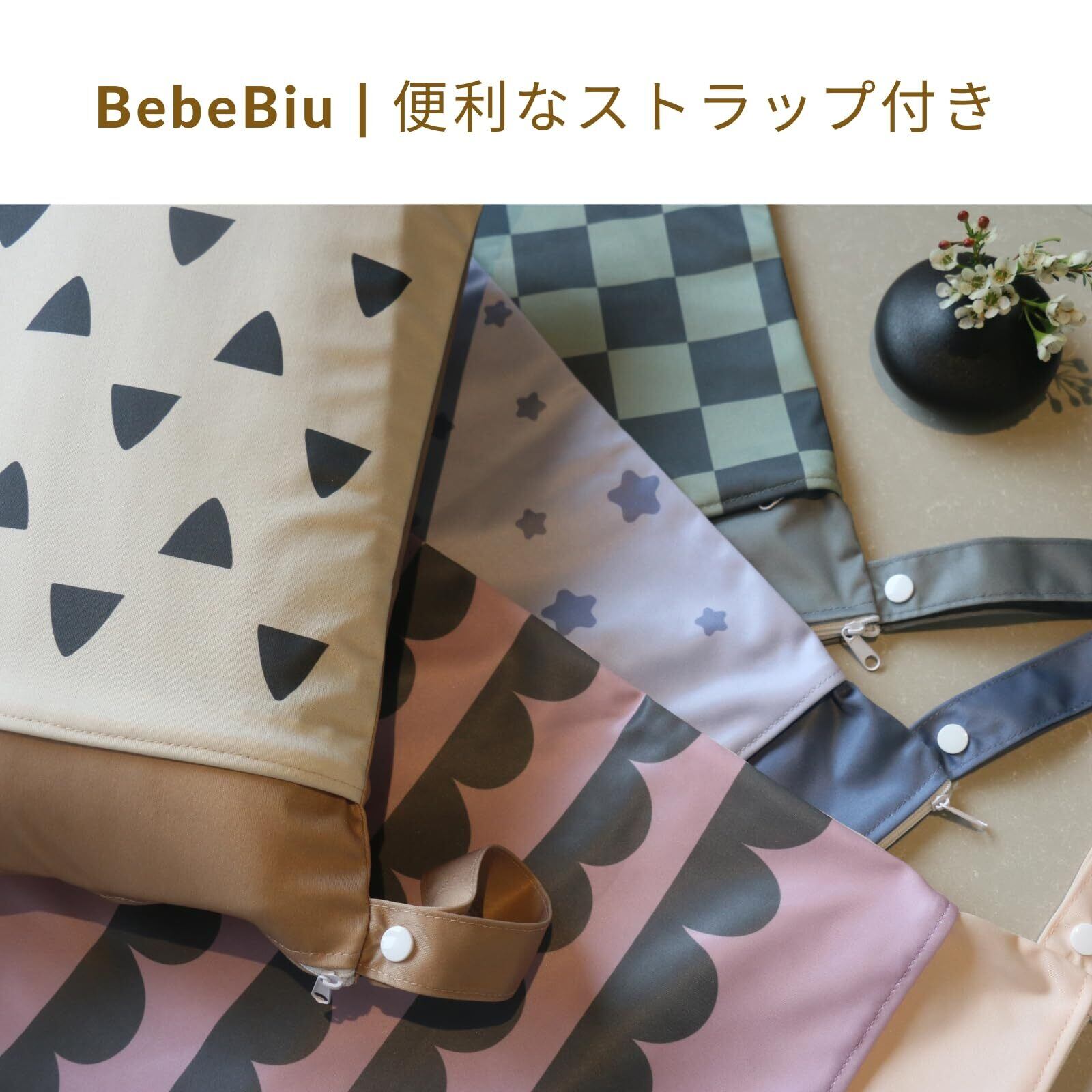 BebeBiu 防水おむつポーチ, ジッパー付き2ポケット, 40×30cm, 幾何学模様デザイン 大容量 保育園 防水 袋 水着入れ(ベージュの三角形)