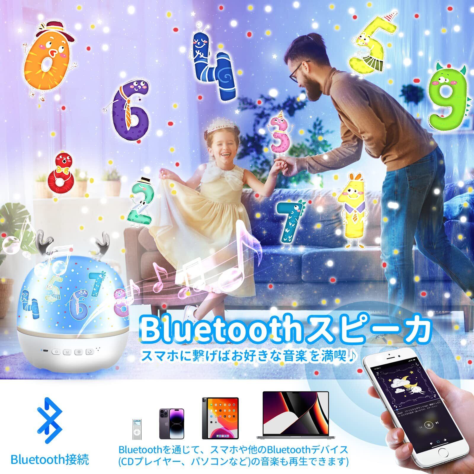 【リモコン対応のBluetooth寝かしつけ用おもちゃ】スタープロジェクターライトはBluetooth対応でスマホに繋げばお好きな音楽を楽しめます。ヽ(゜∇゜ヽ)リモコン操作により離れていてもワンタッチで操作可能です。お子さんが暗い部屋の中で不安にならないよう、カラフルな動物や模様で自然に眠りを誘います。ライトの明るさ調整やタイマー、曲調整も操作でき、お子さんに合わせて自由に設定を調整できます。