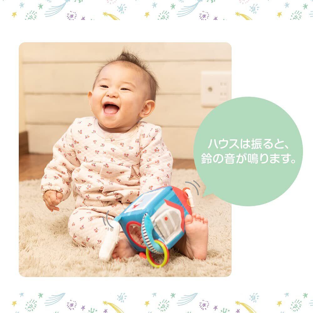 ぶら下がっているニョロニョロは、握るとシャカシャカ音がします。赤ちゃんが大好きなビーズ入りのリングと底面にはミラーもついています。ハウスは振ると鈴の音が鳴ります。
