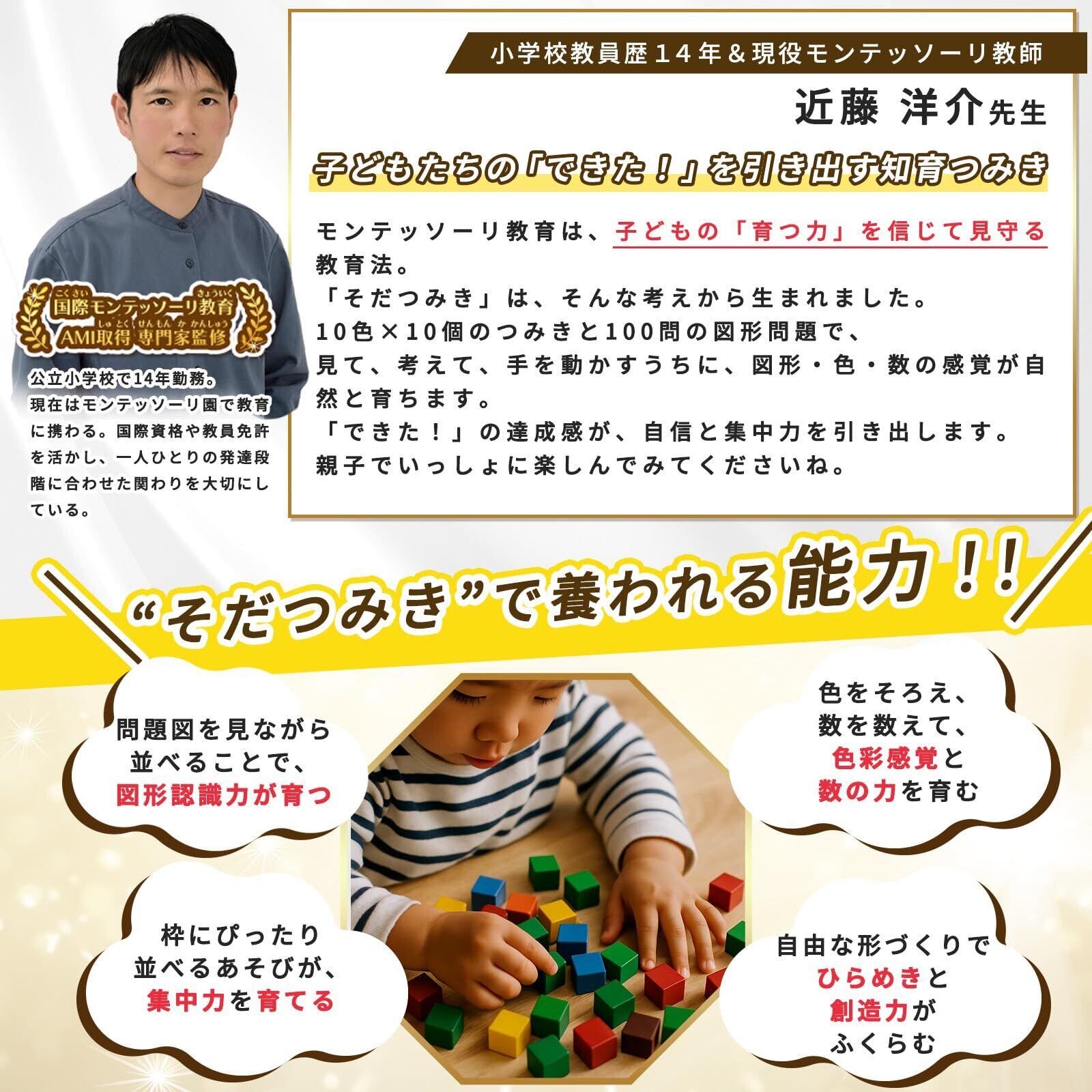 【モンテッソーリ教育の専門家監修】監修は、国際モンテッソーリ教師資格(AMI)を取得した近藤洋介先生。指先を使って積む・並べる・崩すという一連の遊びの中で、秩序感覚・集中力・空間認識力・創造力を総合的に育みます。発達段階に応じて、年齢を問わず遊びながら学べる構成になっています。