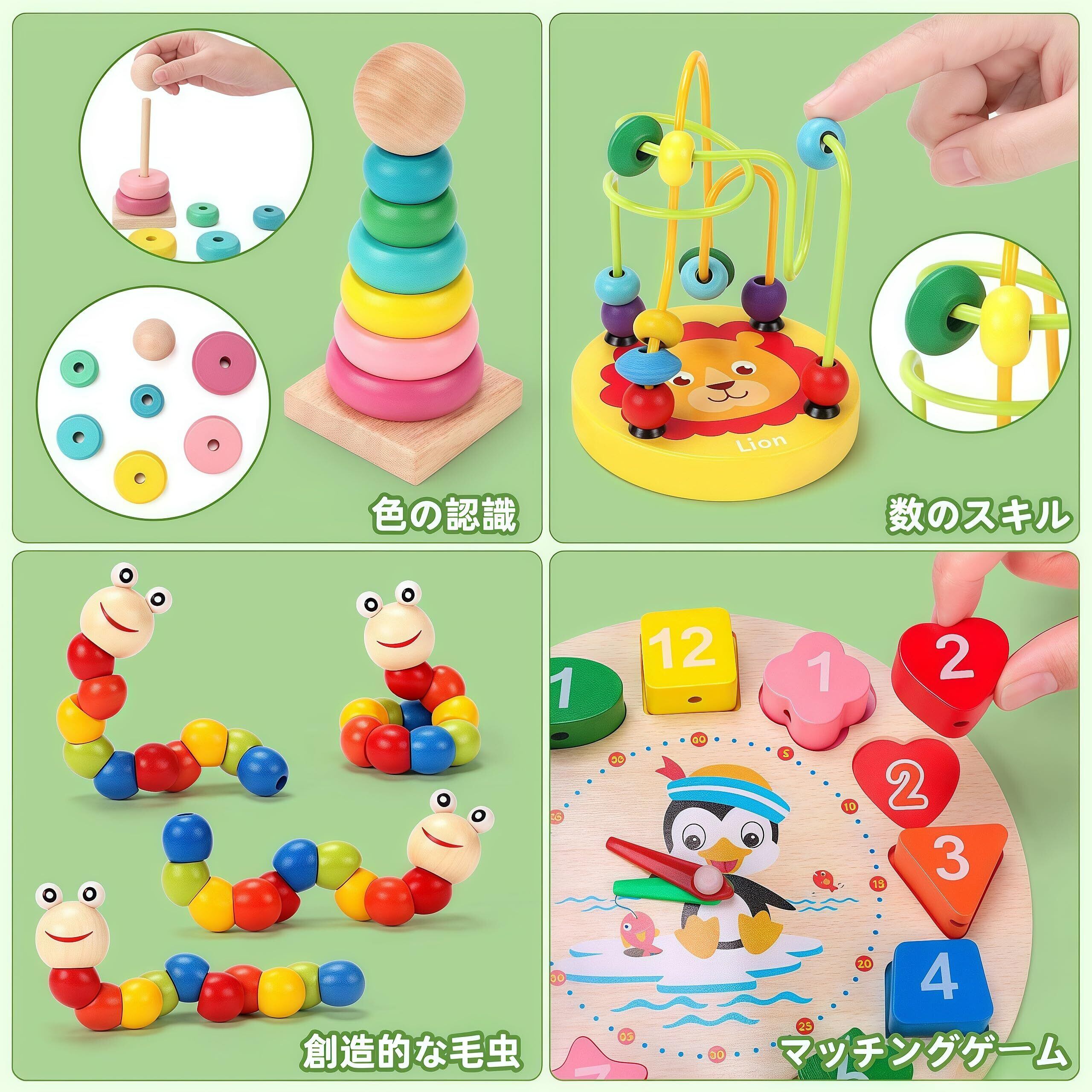 【6点セットのモンテッソーリおもちゃ】 このモンテッソーリ玩具セットには、積み木、木琴、色分け時計、ビーズ迷路、パズル、ねじりおもちゃなど、1 2 3歳の子供が楽しみながら学べる6つのアイテムが含まれています。どのアイテムも、子供の発達を促進するために慎重にデザインされており、長時間遊んでも飽きないように工夫されています。おもちゃを通じて、子供たちは遊びながら楽しさと学びを一緒に体験できます。