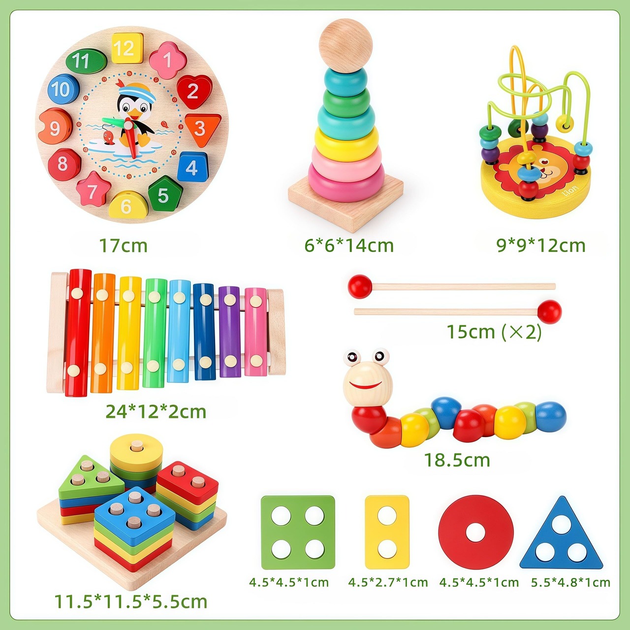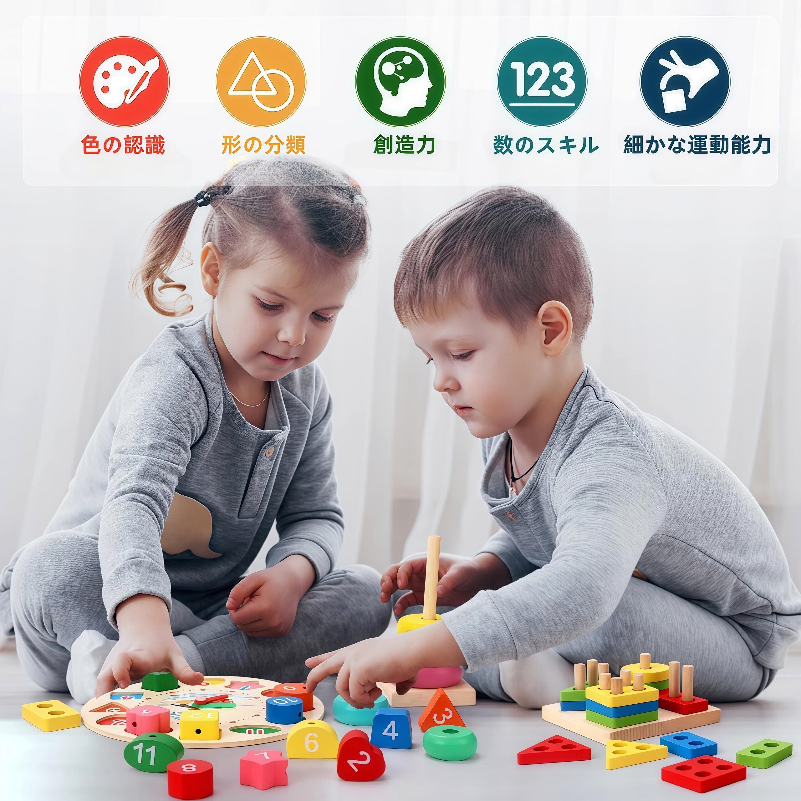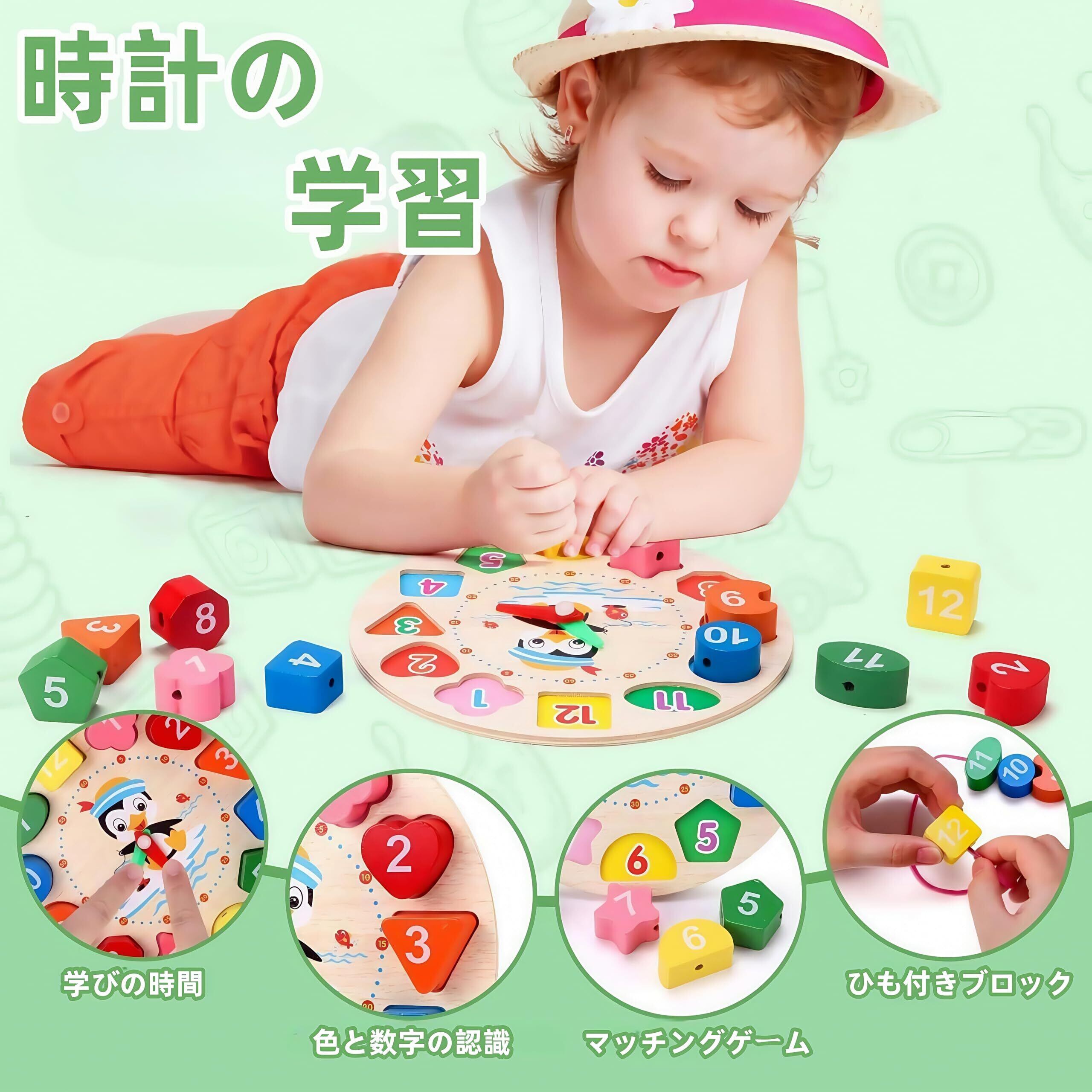 【学びながら遊べるモンテッソーリおもちゃ】 ? 積み木やパズルを使って、子供たちは自分の創造力や想像力を広げ、手指の細かい動きや手と目の協調性、色の識別能力を自然に身につけることができます。さらに、木琴は音感を育てるとともに、音楽への興味を引き出します。時計のパズルは、時間の概念を学び、数字や形を覚えるのにも役立ちます。お子様の成長に欠かせない、楽しく教育的な遊びを提供します。