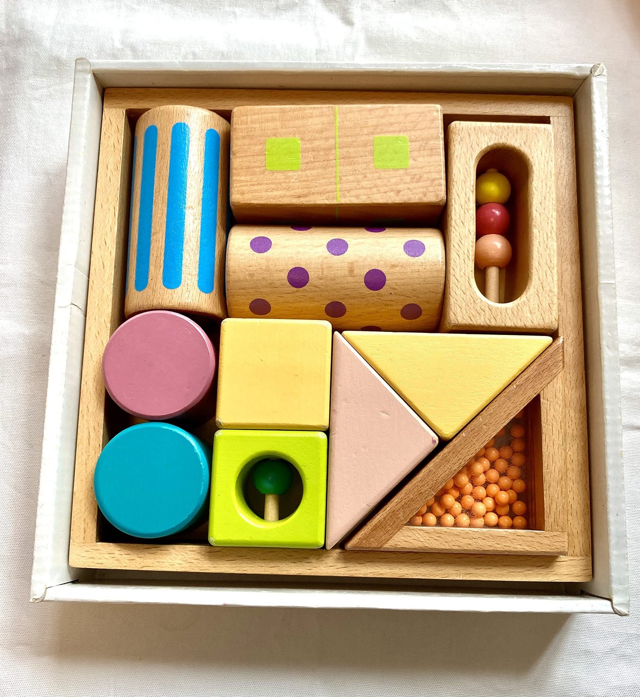 木目が見えるやさしい色の塗装がされた、全ブロック音入りのつみき。丸・三角・四角それぞれに