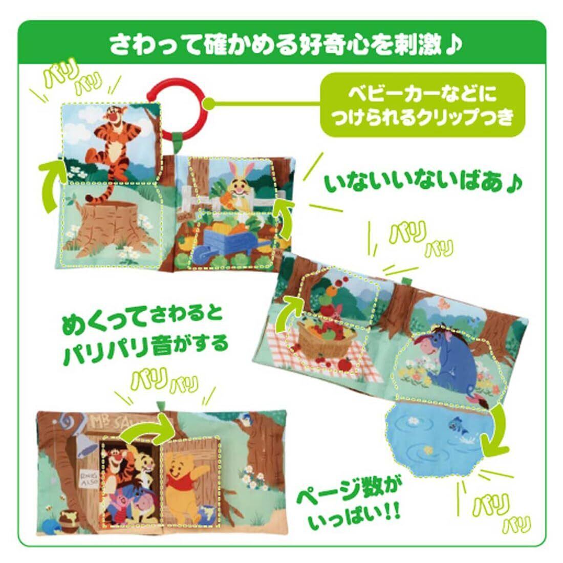 お出かけに便利なリング付き、くまのプーさんのパリパリ入り布絵本です。