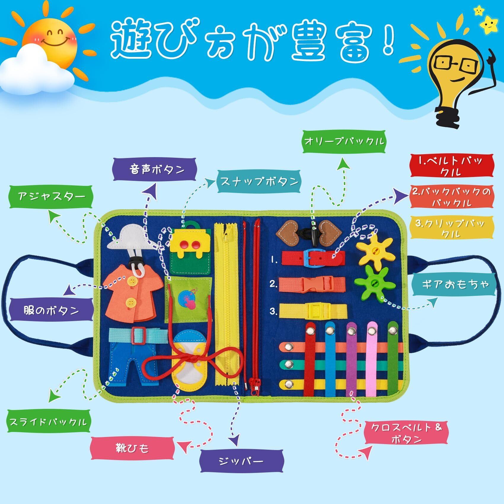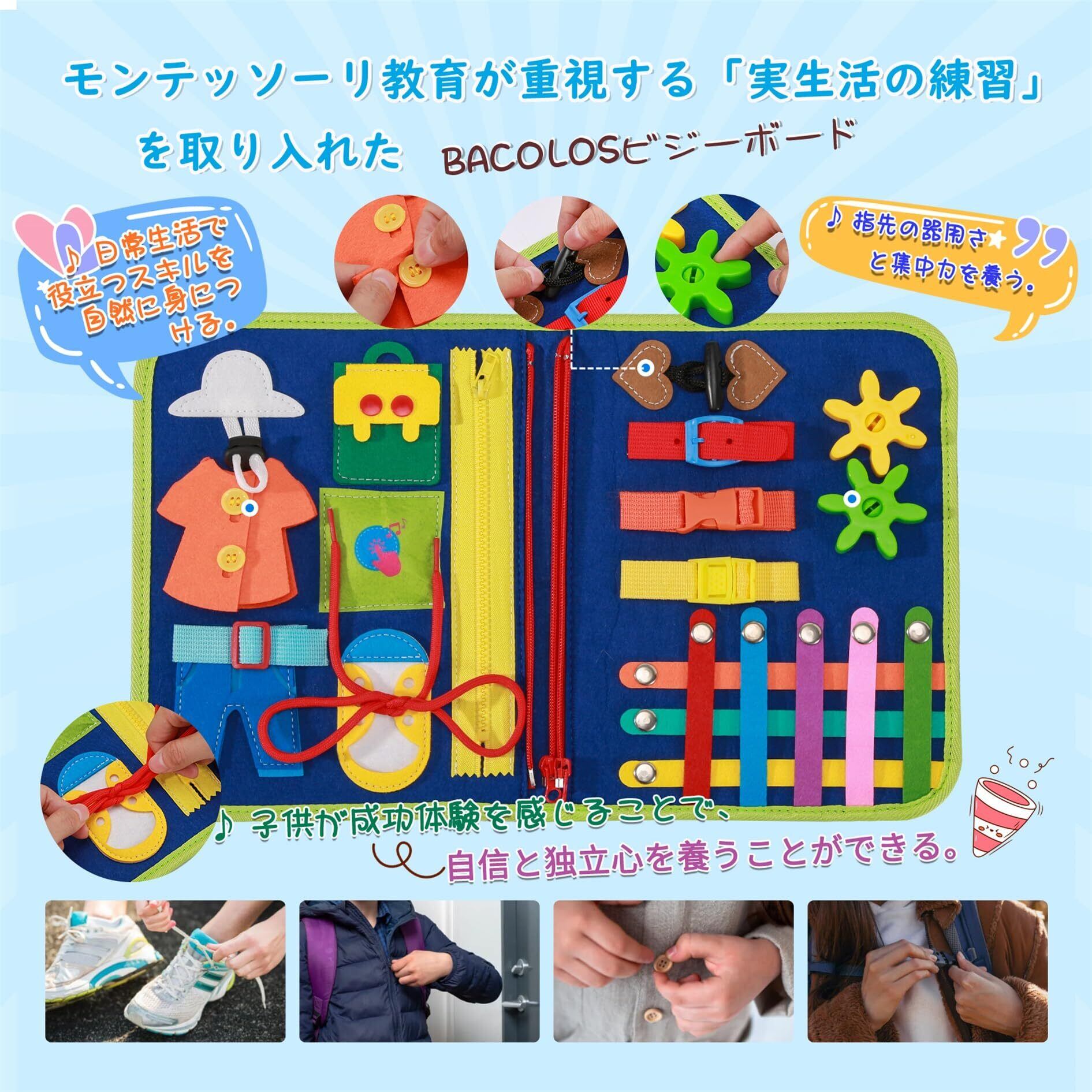 Bacolos ビジーボード モンテッソーリ 玩具 幼児 1 2 3 4 5 6歳 知育玩具 男の子 女の子 おもちゃ お着替えの練習 指先訓練 算数 色認識 形状認識 五十音順図 誕生日 プレゼント