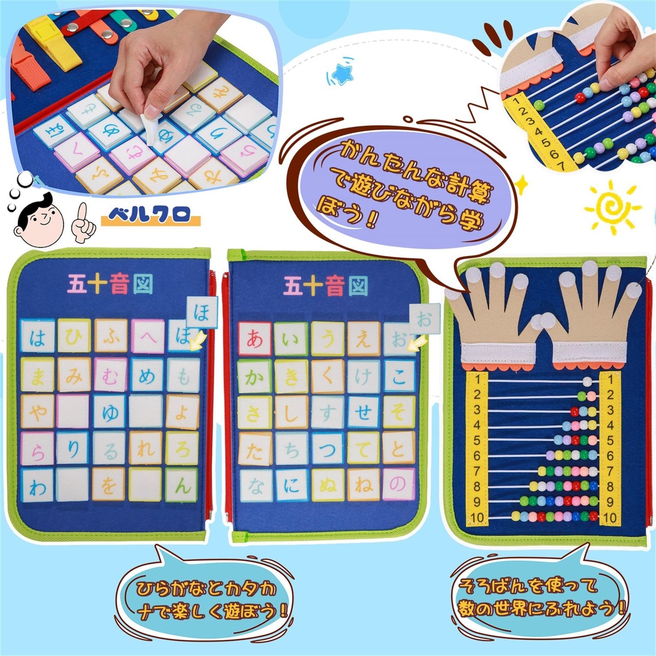 【豊富なコンテンツ】合計5枚10ページの内容。お着替えの練習、色、形の認識、指算、五十音図など、合計20種類以上のコンテンツが搭載されています。様々な動きや学びの要素が組み合わさっており、成長に応じた学びができるため、長期間お使いいただけます。