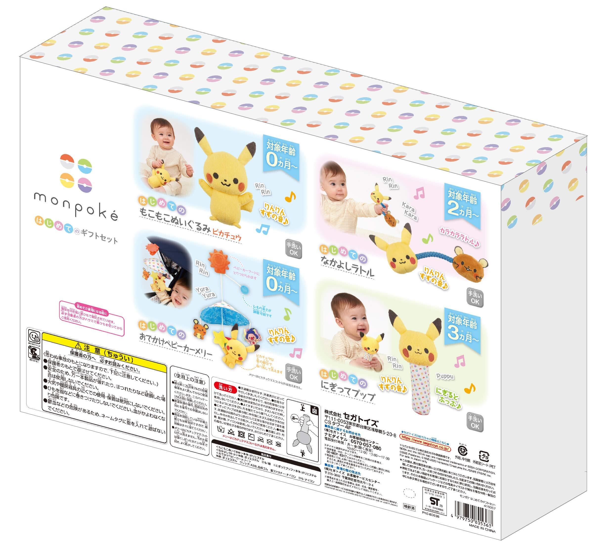 ギフトボックスの中には、もこもこぬいぐるみピカチュウ、なかよしラトル、にぎってプップ、おでかけベビーカーメリーの合計4アイテムのセットです。