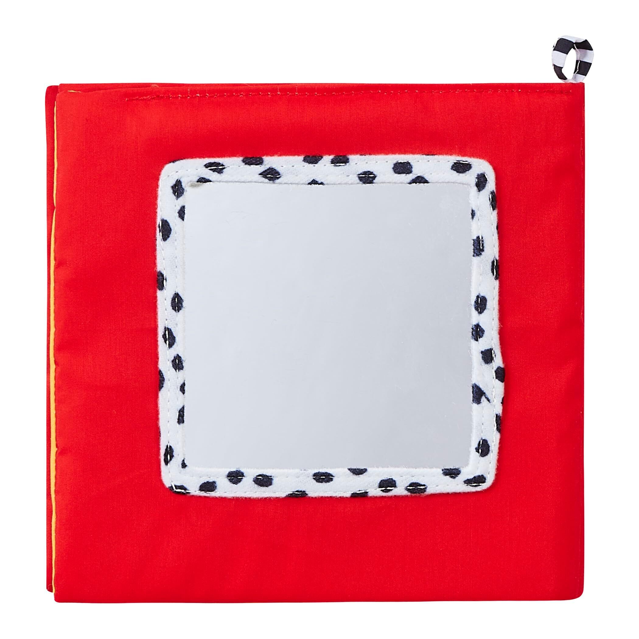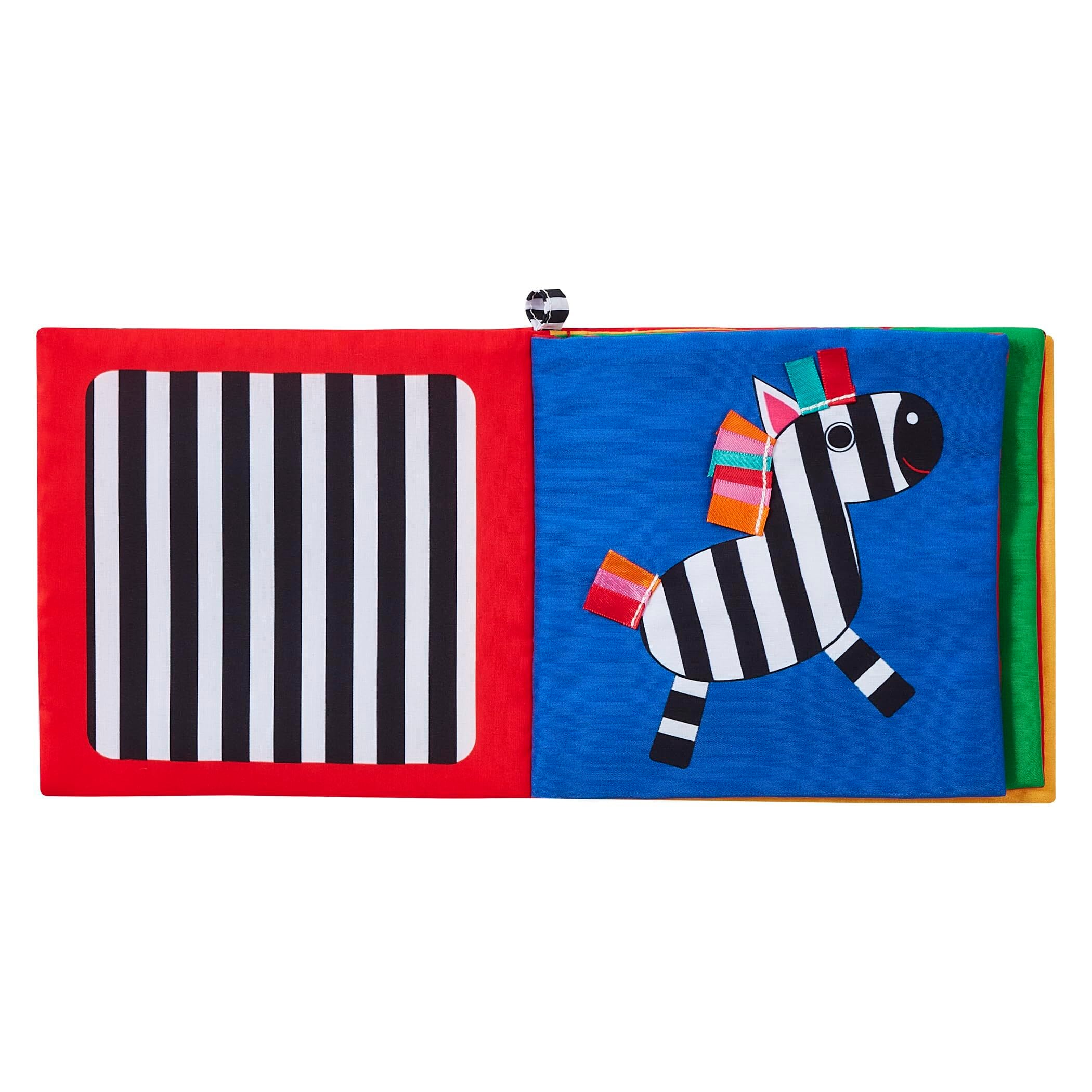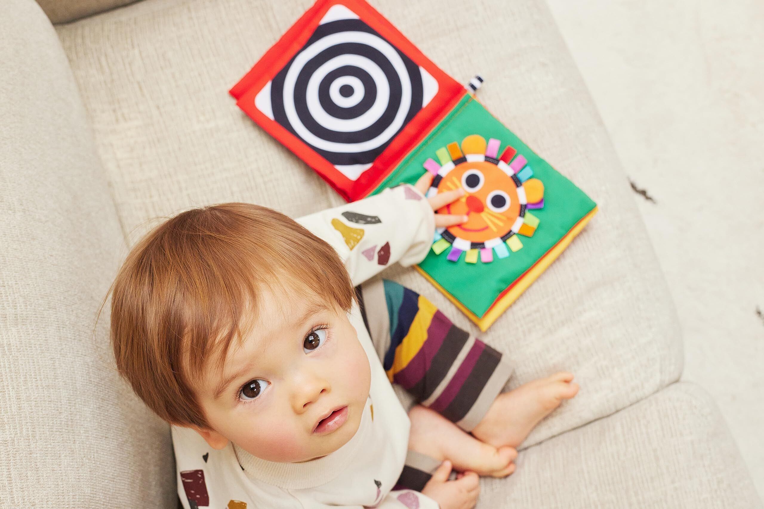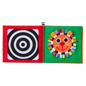 赤ちゃんが認識しやすい白黒のぐるぐる、ドット、しましまのページの隣には、楽しい仕掛けがたくさんあるカラフルなページが。