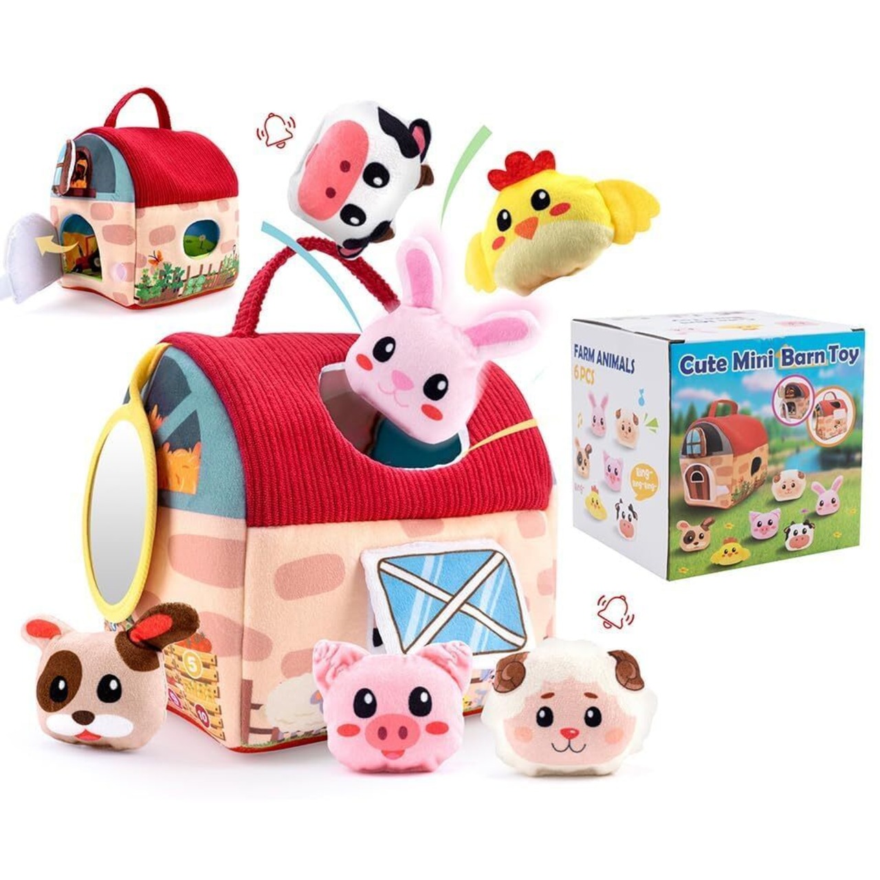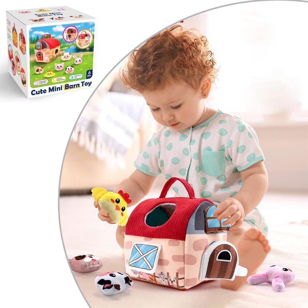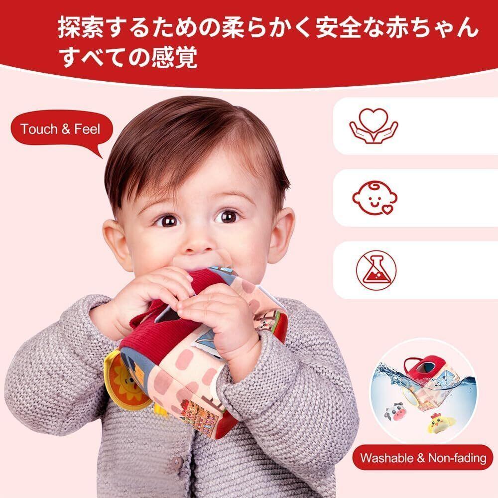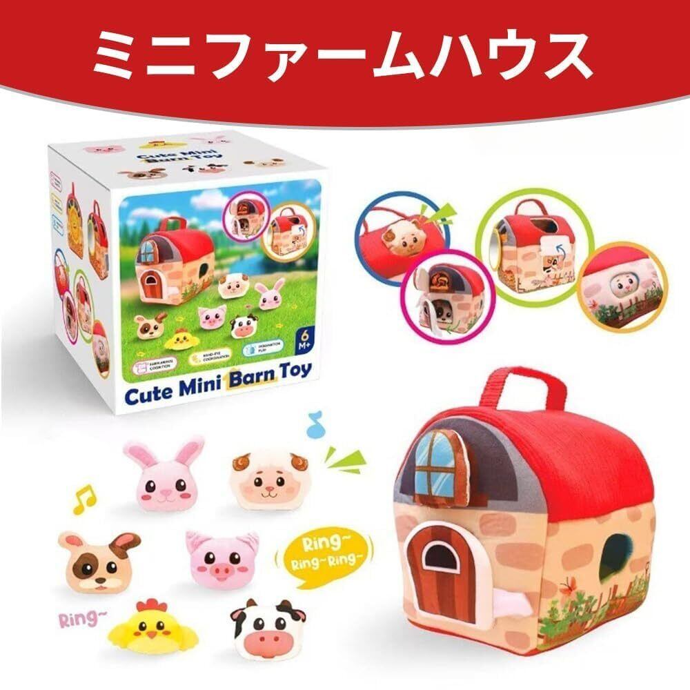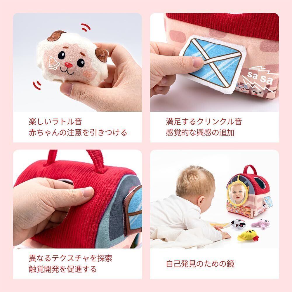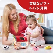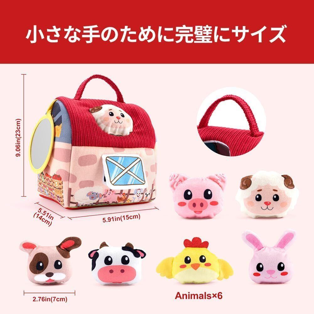 【0-12ヶ月の成長を見守る農場セット】柔らかい布製の、谷倉1つと6種類の動物ぬいぐるみ(ウサギ・ヒヨコ・ブタ・ヒツジ・ウマなど)がセットになっています。各動物には異なる音が仕込まれており、触れると紙の音(ウサギ)、鈴の音(ヒヨコ)、鳴き声(ブタ)などが鳴る仕組み。自己認識を育み、喜びの瞬間を刺激します。