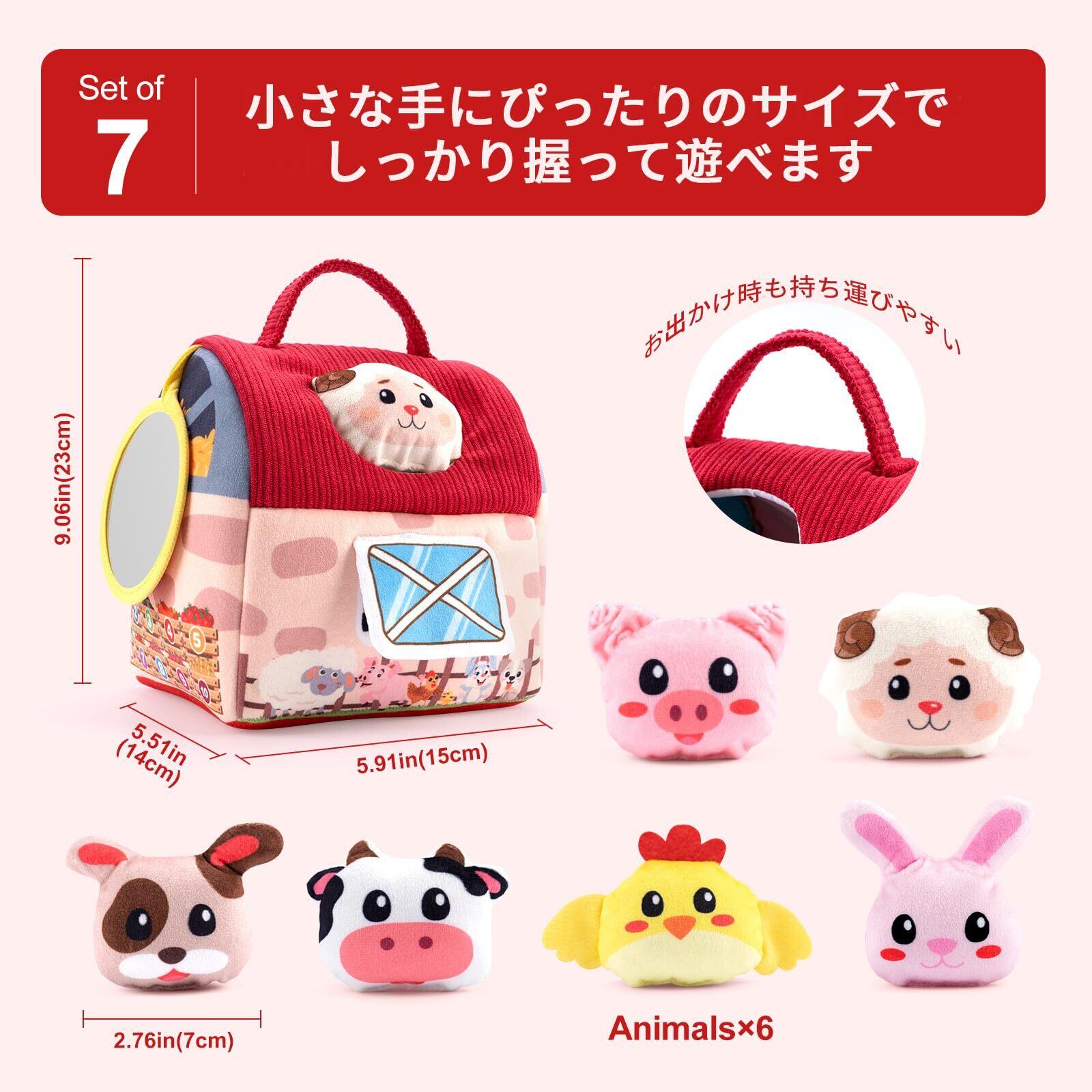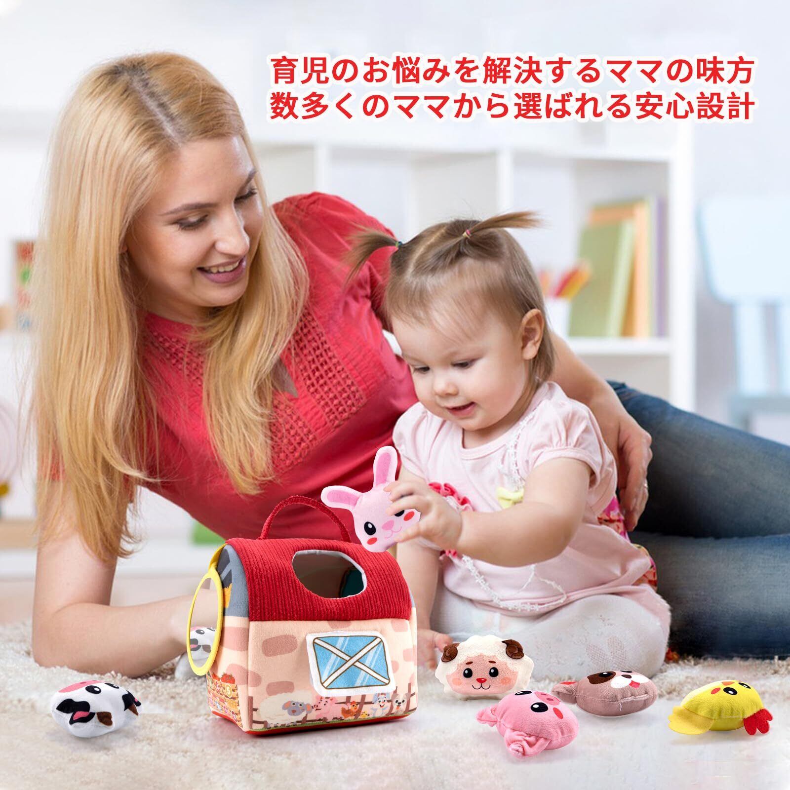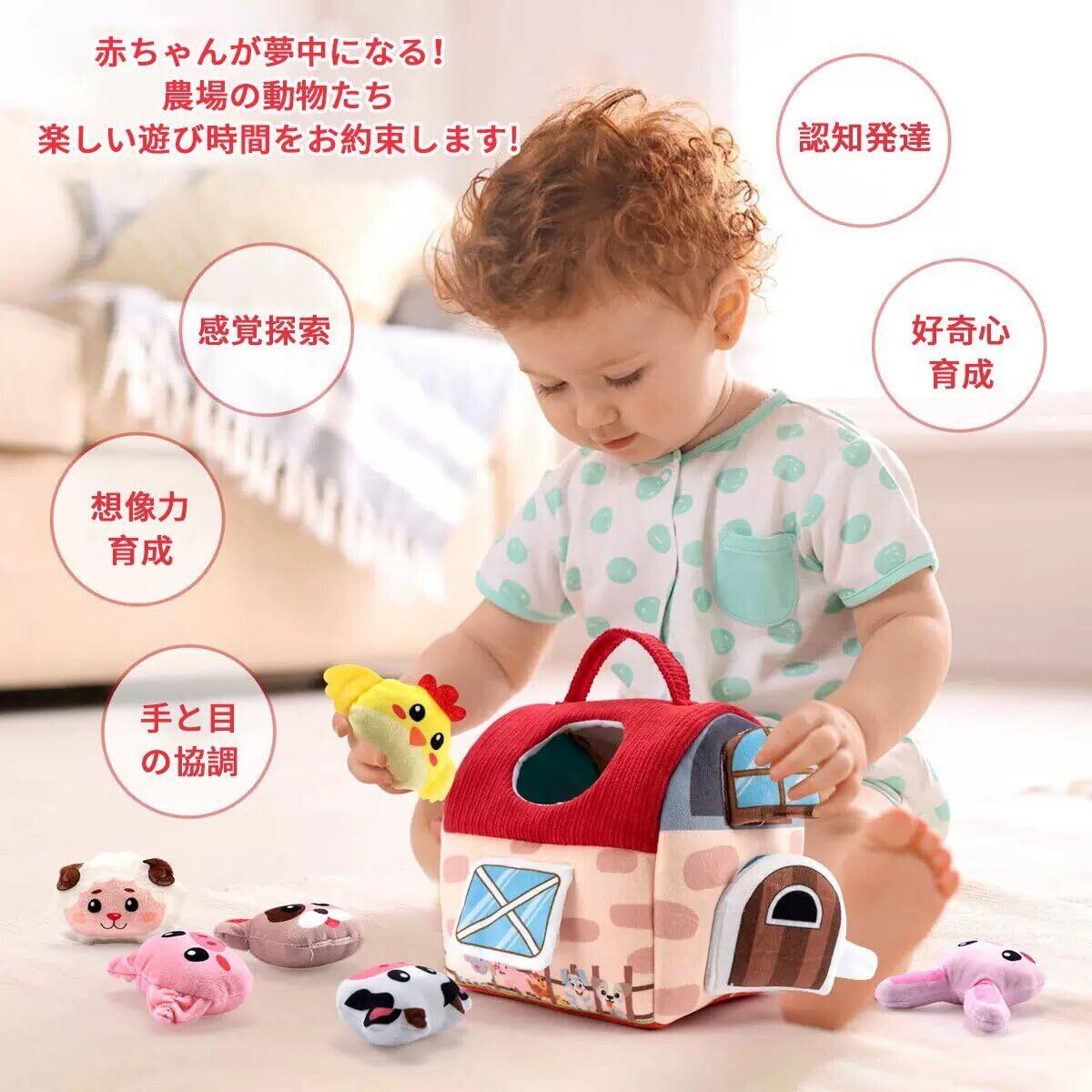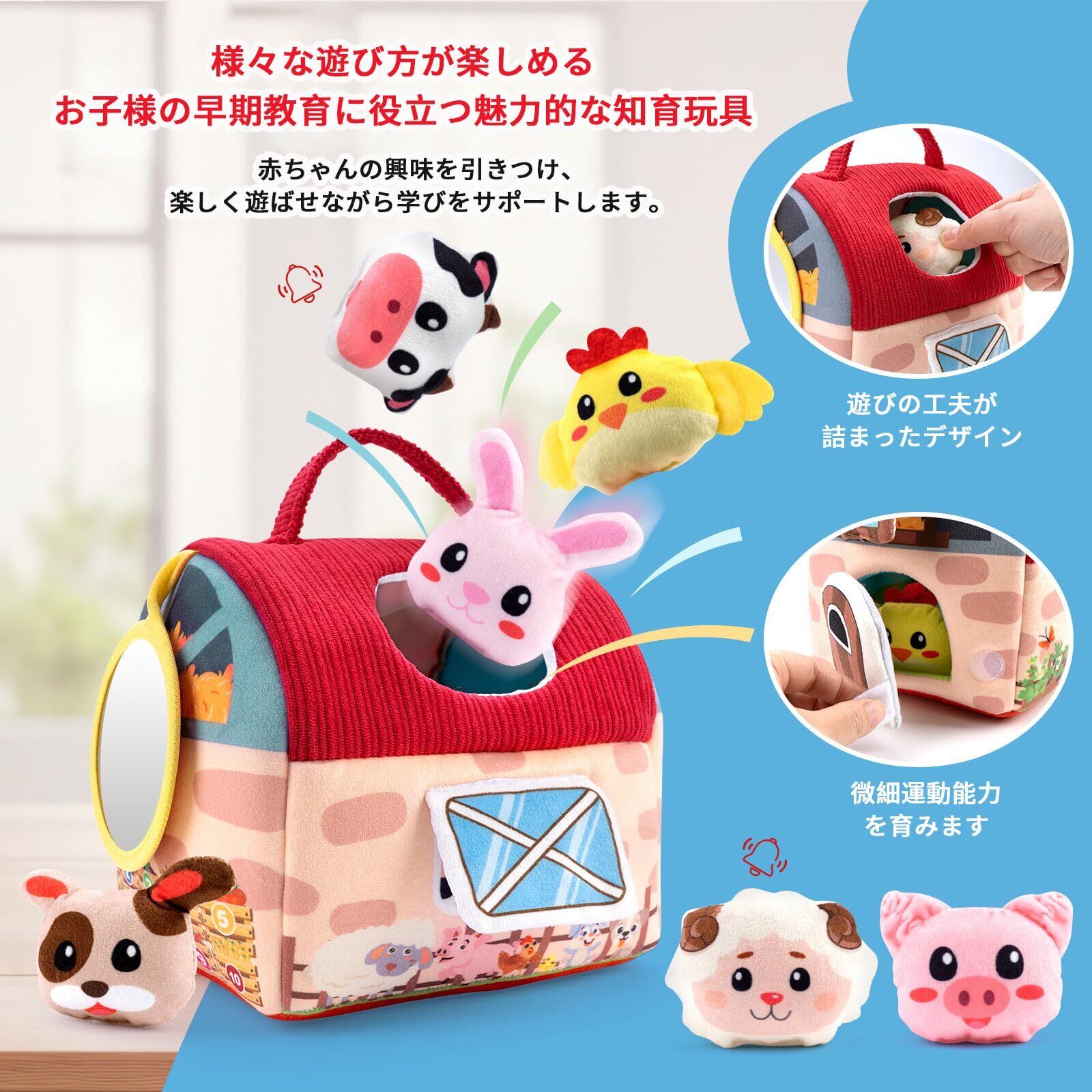 【0-12ヶ月の成長を見守る農場セット】柔らかい布製の知育玩具で、谷倉1つと6種類の動物ぬいぐるみ(ウサギ・ヒヨコ・ブタ・ヒツジ・ウマなど)がセットになっています。各動物には異なる音が仕込まれており、触れると紙の音(ウサギ)、鈴の音(ヒヨコ)、鳴き声(ブタ)などが鳴る仕組み。月齢に合わせた発達を促し、0-3ヶ月は視覚刺激、3-6ヶ月は因果関係の理解、6-12ヶ月は創造力の発達をサポートします。