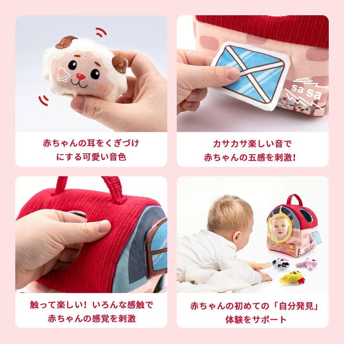 【五感を育む楽しい遊び】安全な鏡で自己認識を促し、様々な素材の触り心地(ヒツジのふわふわ毛など)と音(ウマのカラカラ音など)で聴覚・触覚・視覚を同時に刺激。1歳から3歳まで長く遊べる工夫が詰まっています。