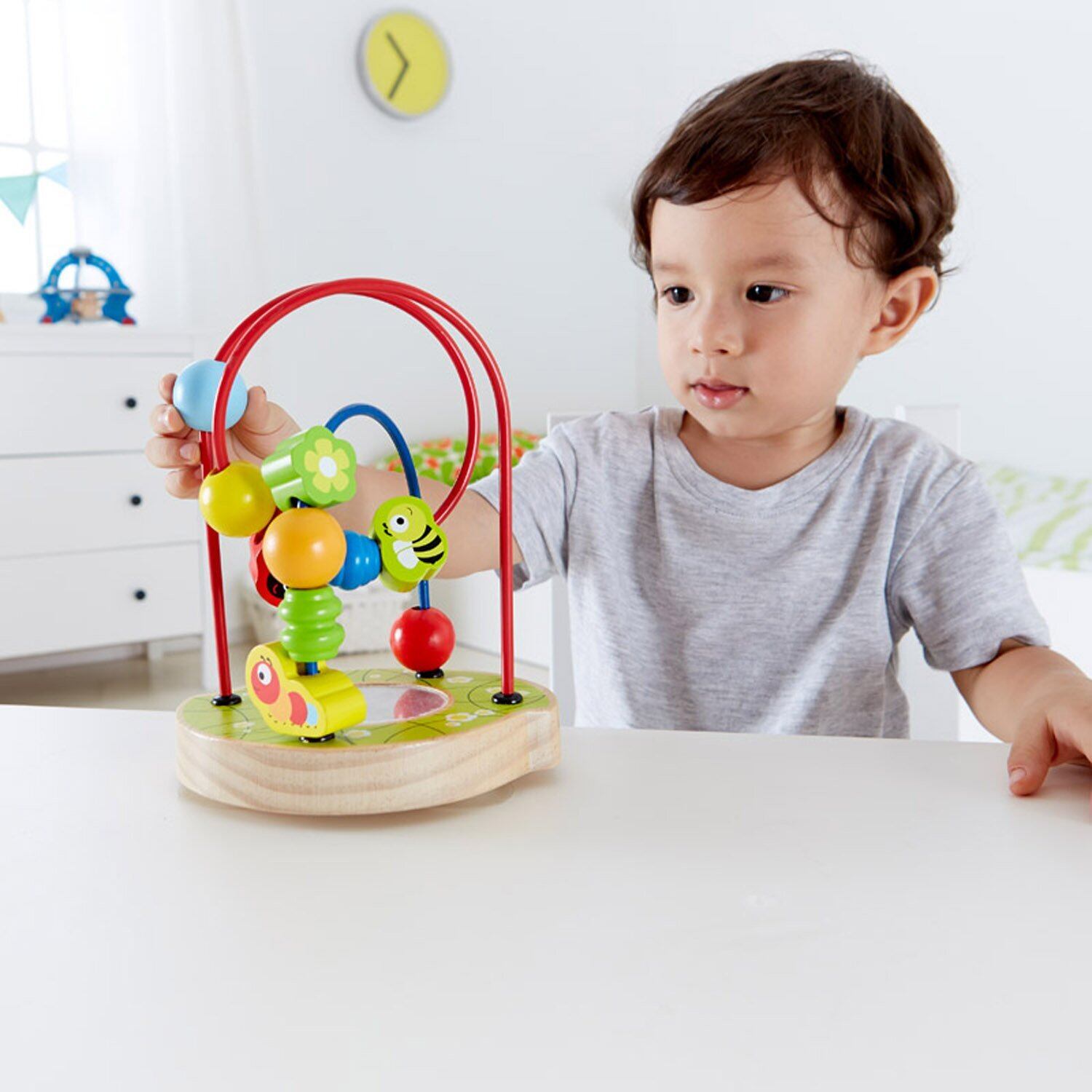 はちさんやあおむしさんが、複雑な形のワイヤーの冒険に出かけます。くるんと回ってどこに行くのかな?月齢の小さいお子さまでも簡単に遊べ、手と指先を使いながら空間認知能力も育める玩具です。