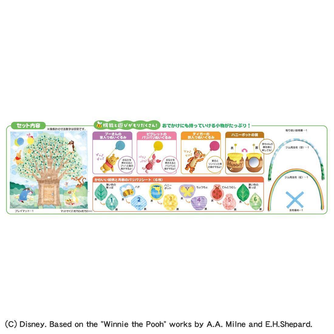 【セット内容】マット(1),ジム用支柱(2),ぬいるぐみ(プー、ピグレット、ティガー)(3),ふうせん(水色・黄色・ピンク)(3),パリパリシート(6),ハニーポットの鏡(1),支柱留め(1),取扱説明書(1),