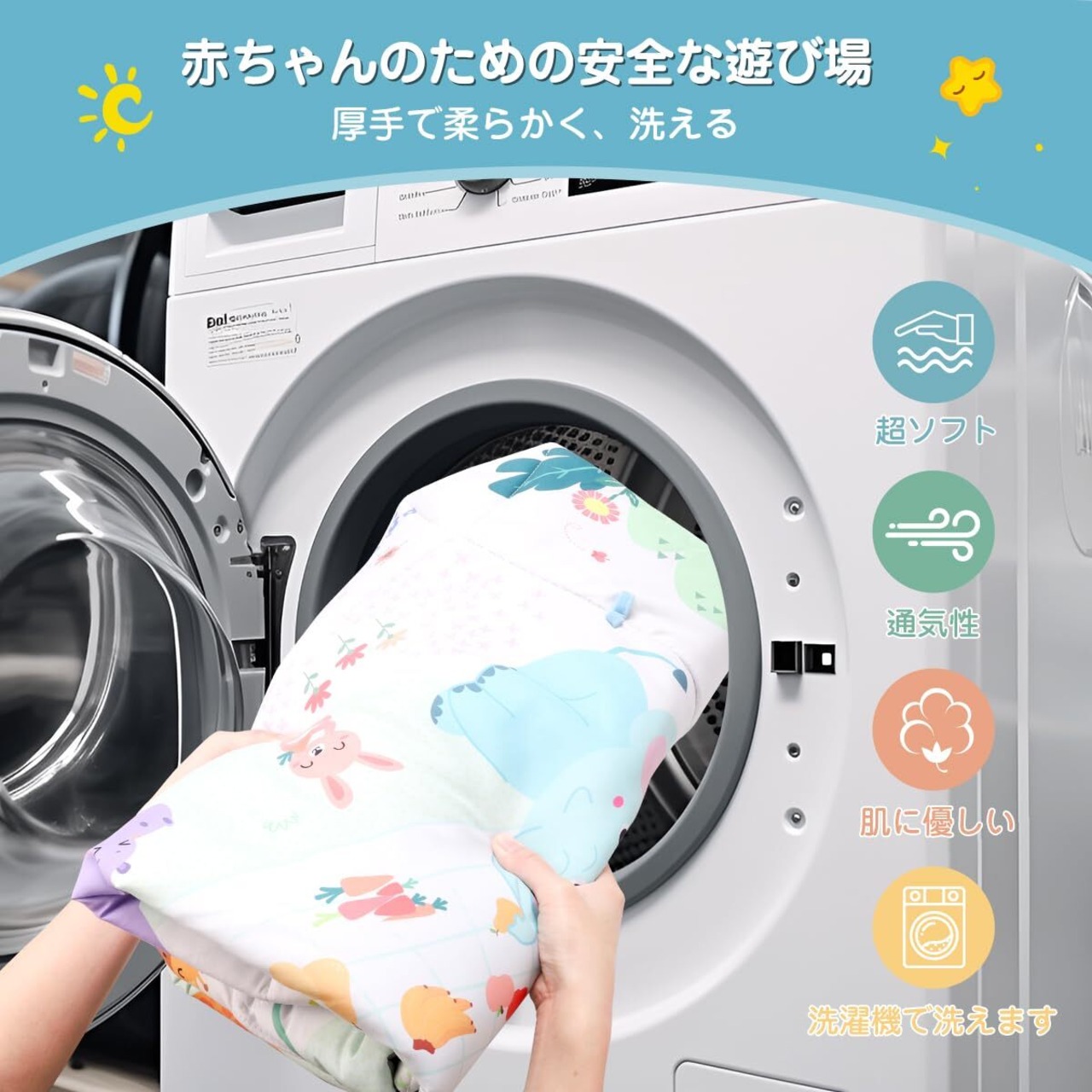 組み立ても簡単だし、素材も柔らかくてよかった!柔らかいけど沈むほどではないので、うつ伏せで遊ぶときなどは安心して見てられます。軽いし、全てのパーツが取り外し簡単だし、マットは洗濯してもすぐ乾きそうな素材だ。子供が安全な遊び体験をすることを確保しています。ゲームマットの精細な織物の縫製と緊密な縫製技術は、引き裂きにくく、機械洗濯ができ、清潔になりやすい。