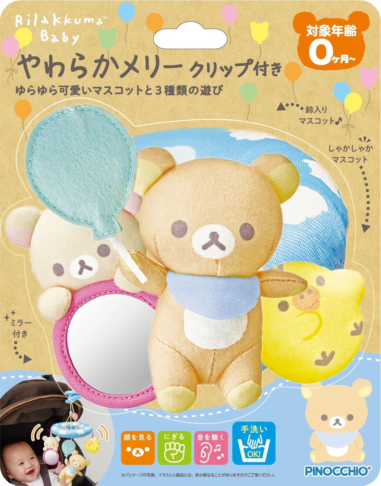 ●リラックマ、コリラックマ、キイロイトリの可愛いマスコットがついた、ベビーカーに取付できるメリーです。