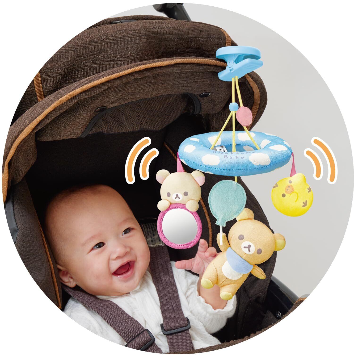 ベビーカーの振動や風で、リラックマたちが揺れて赤ちゃんの興味を惹きます。