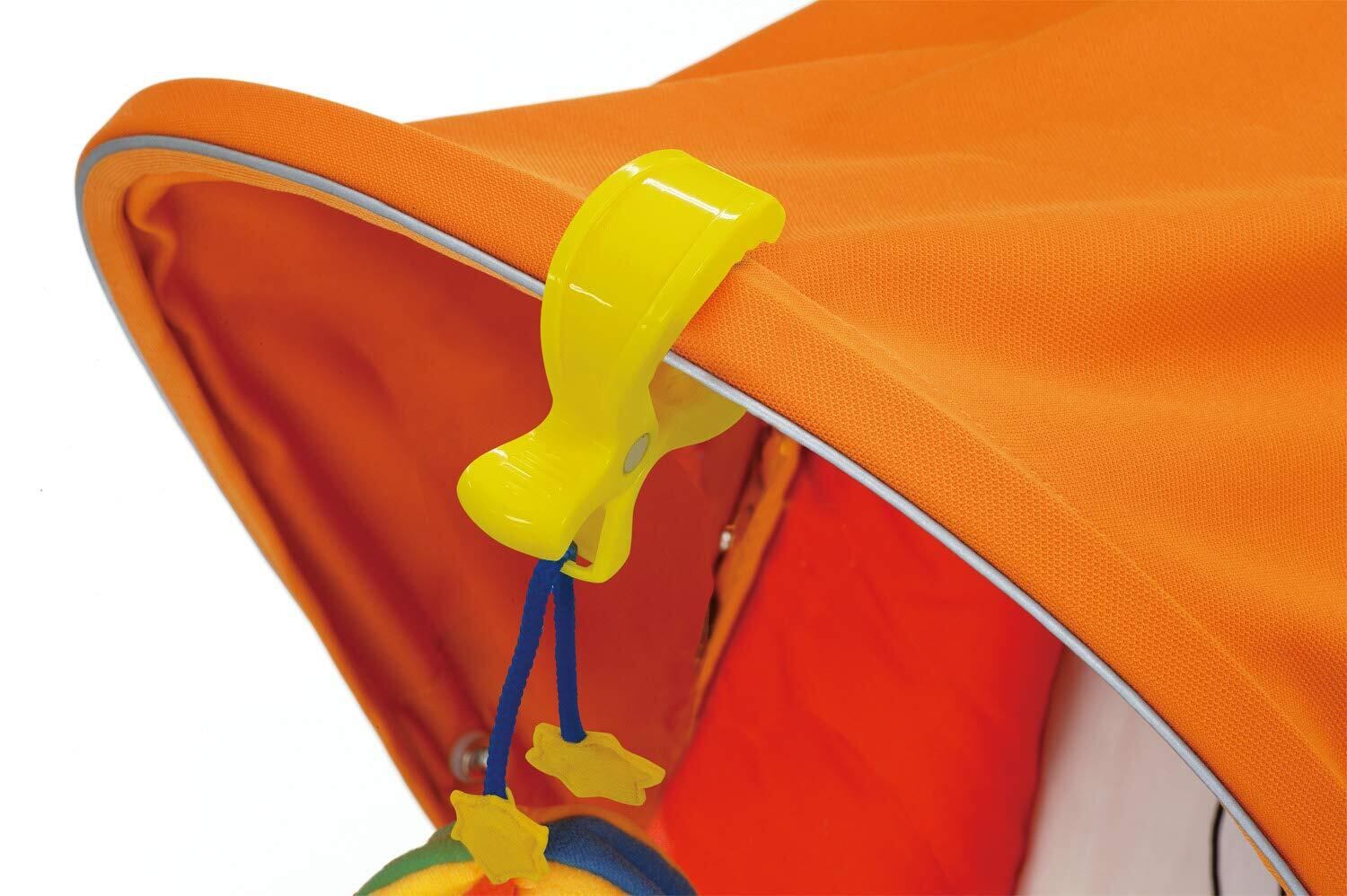 ●クリップでベビーカーのフードやバーの部分、ベビーベッドやチャイルドシートなどいろいろな所に取り付けられます。
